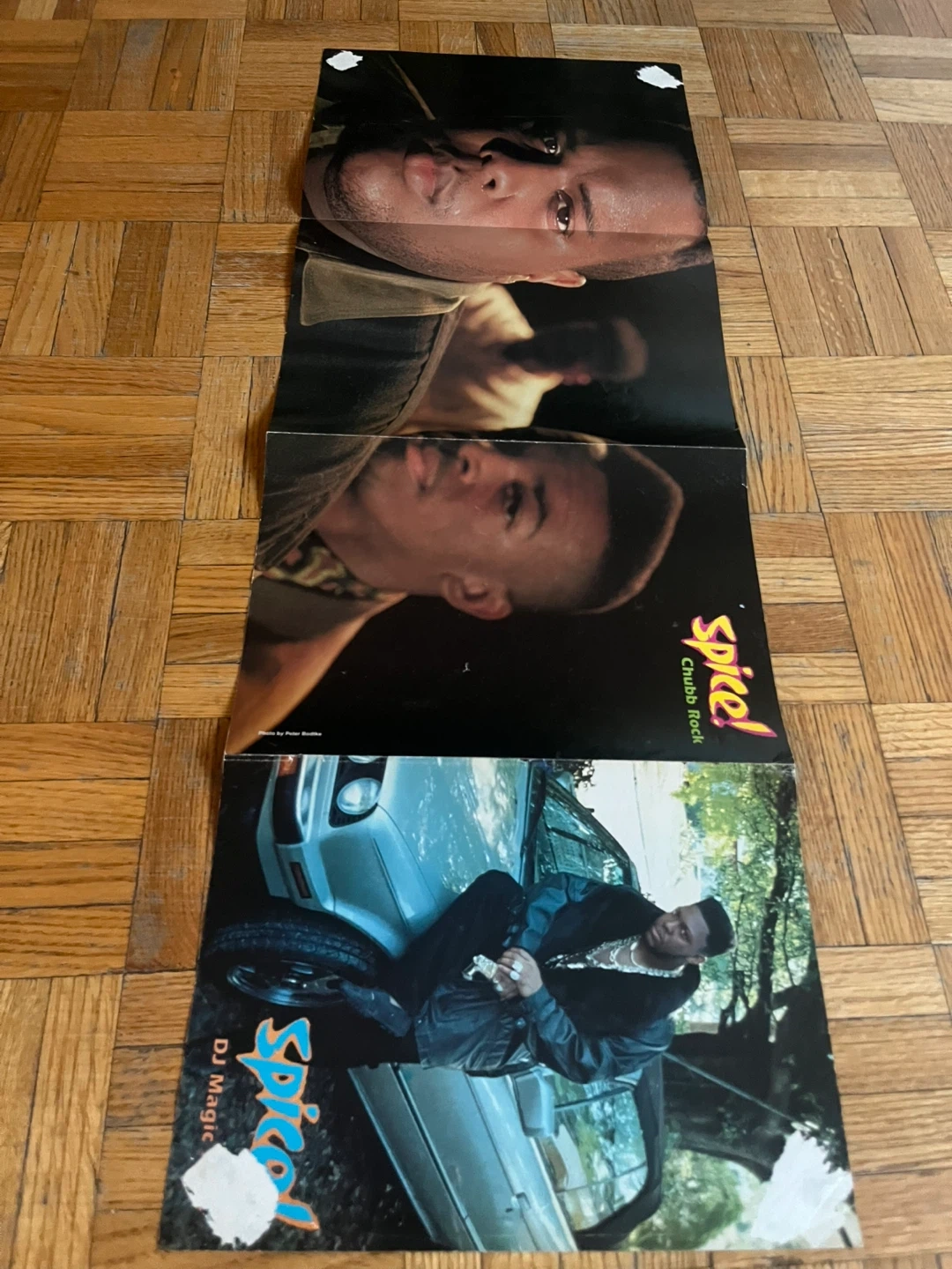This lot includes several Spice! magazine posters featuring artists like LL Cool J and Chubbs. They're large format promotional items from the era. The posters are creased from being folded.