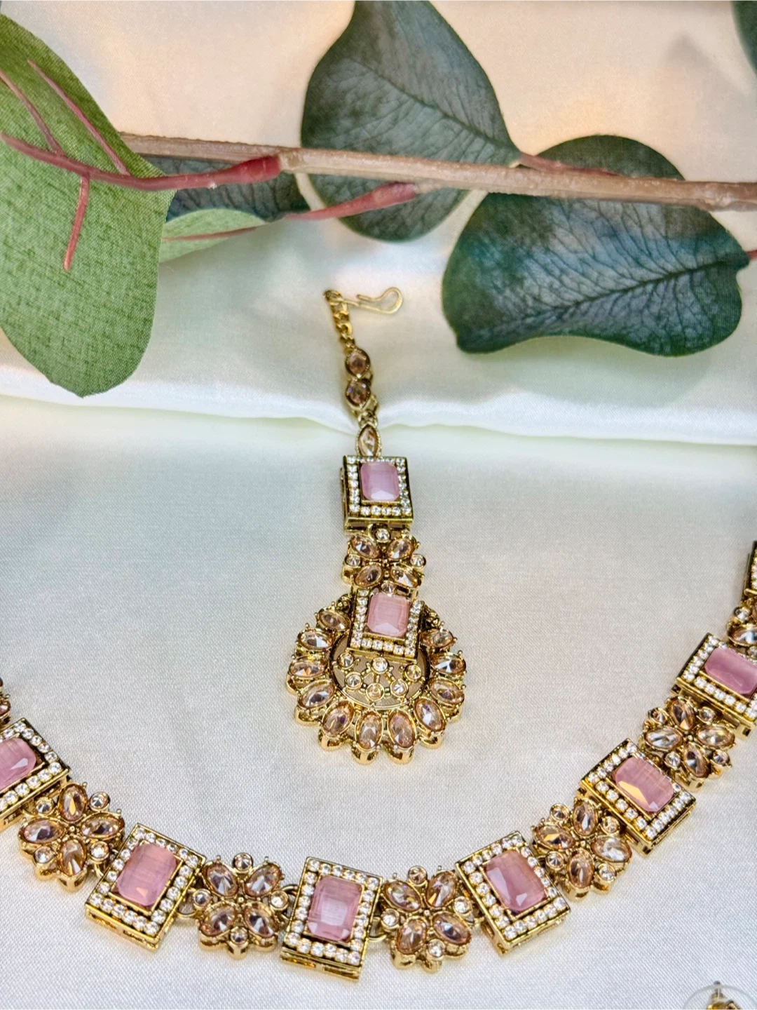 Beautiful gold-toned necklace set with sparkling stones and elegant pink square gems. Includes matching earrings and a tikka. It's perfect for special occasions!