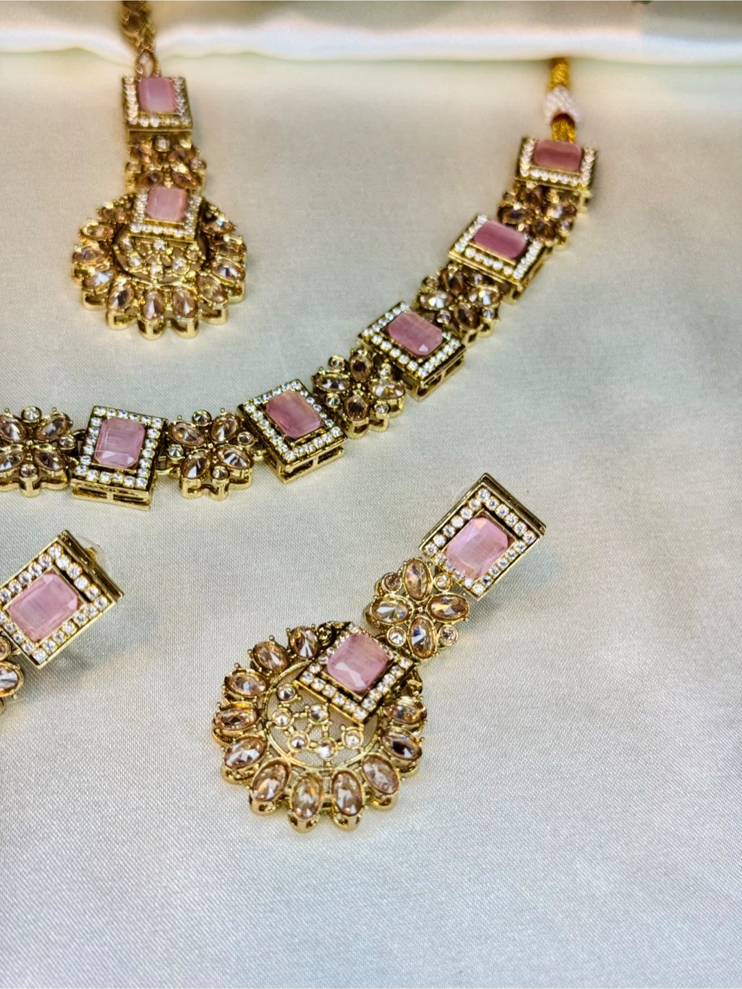 Beautiful gold-toned necklace set with sparkling stones and elegant pink square gems. Includes matching earrings and a tikka. It's perfect for special occasions!