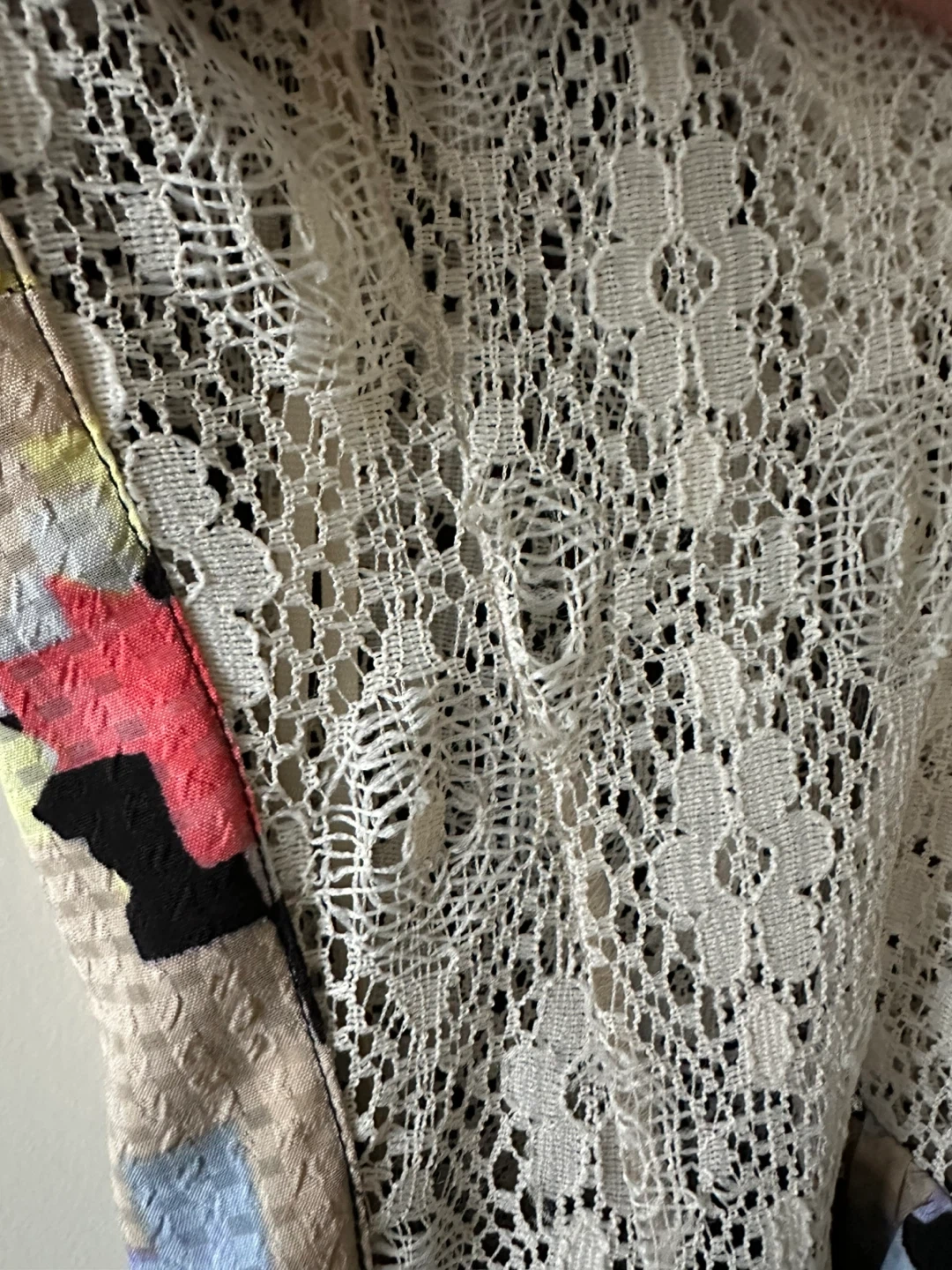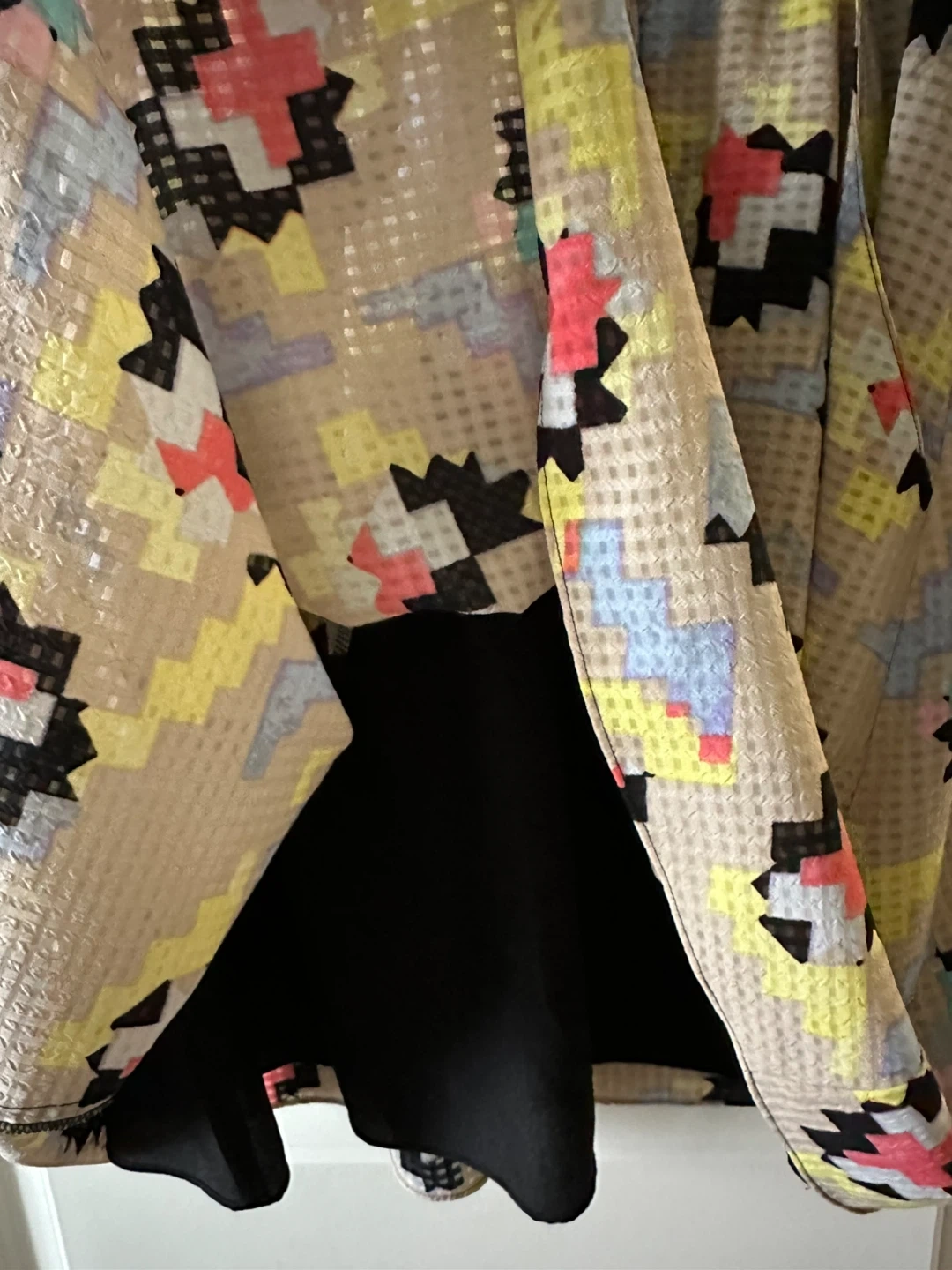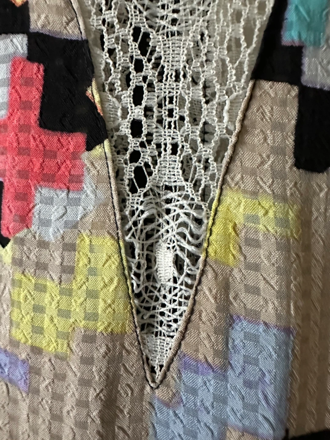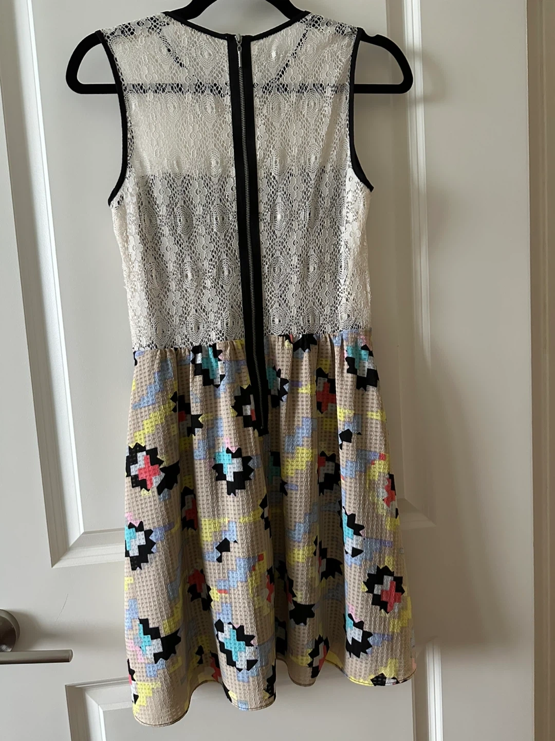 Short A-line dress. Features a colourful geometric print and a lace bodice. Zipper closure on back. Has pockets. Black liner under skirt. Minor lace wear and tear on side/back (see photos). Size 4.