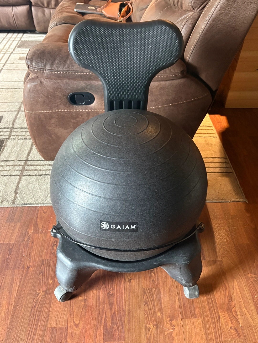 Selling a Gaiam balance ball chair! It's a great way to improve your posture and engage your core while you work or study. This chair features a black exercise ball on a wheeled base with a supportive back. Perfect for home or office use!
