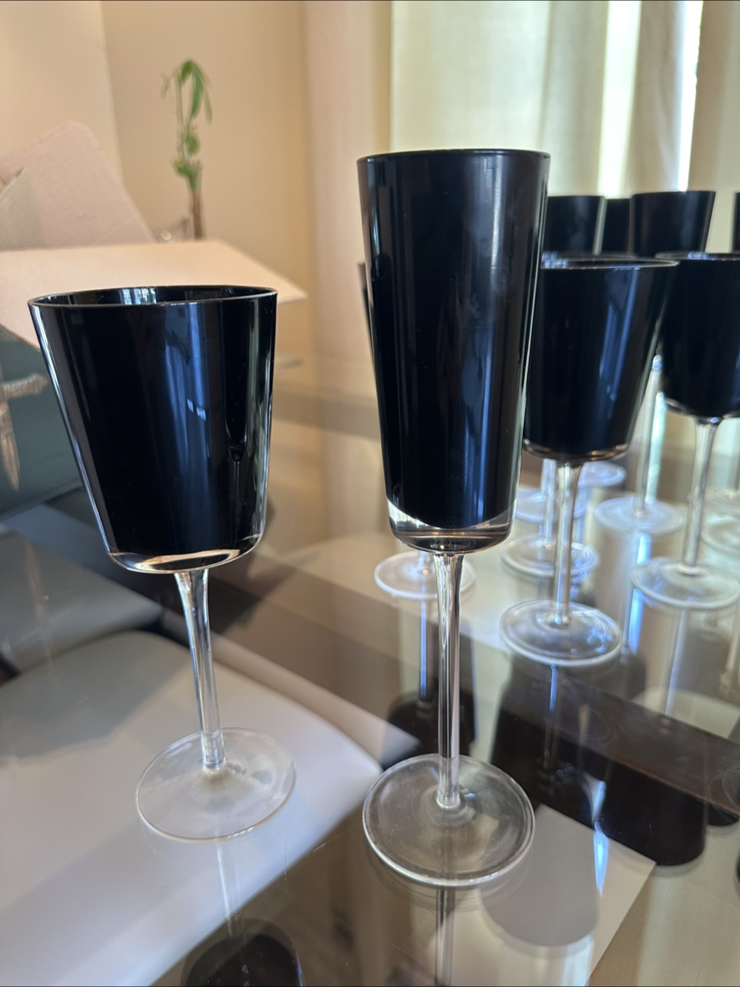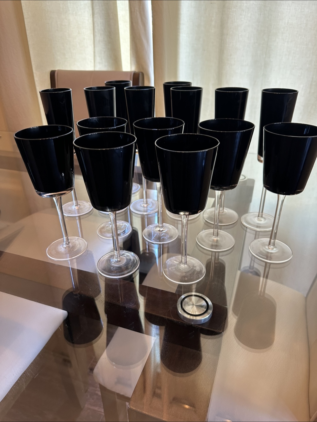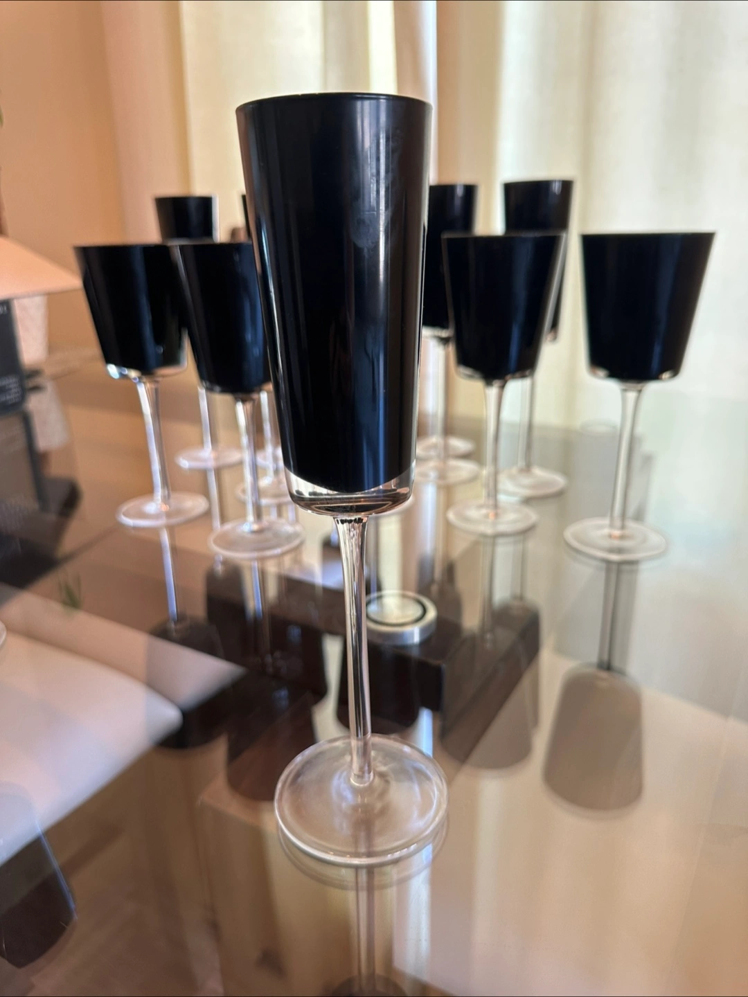 Selling a set of 15 elegant black stemmed glasses. They're in great condition and would make a lovely addition to any home bar or dining setting