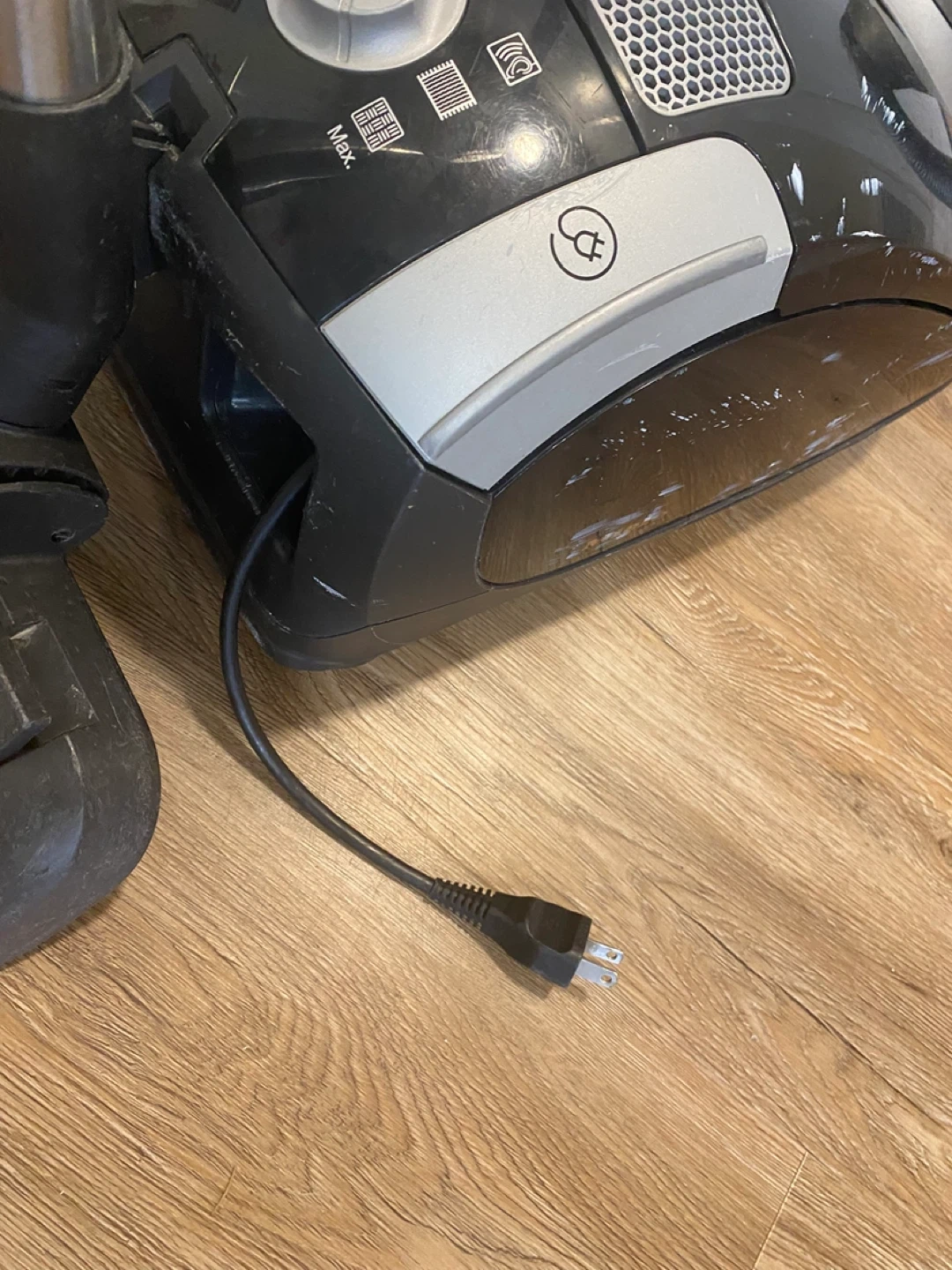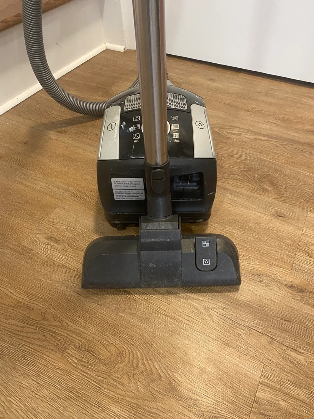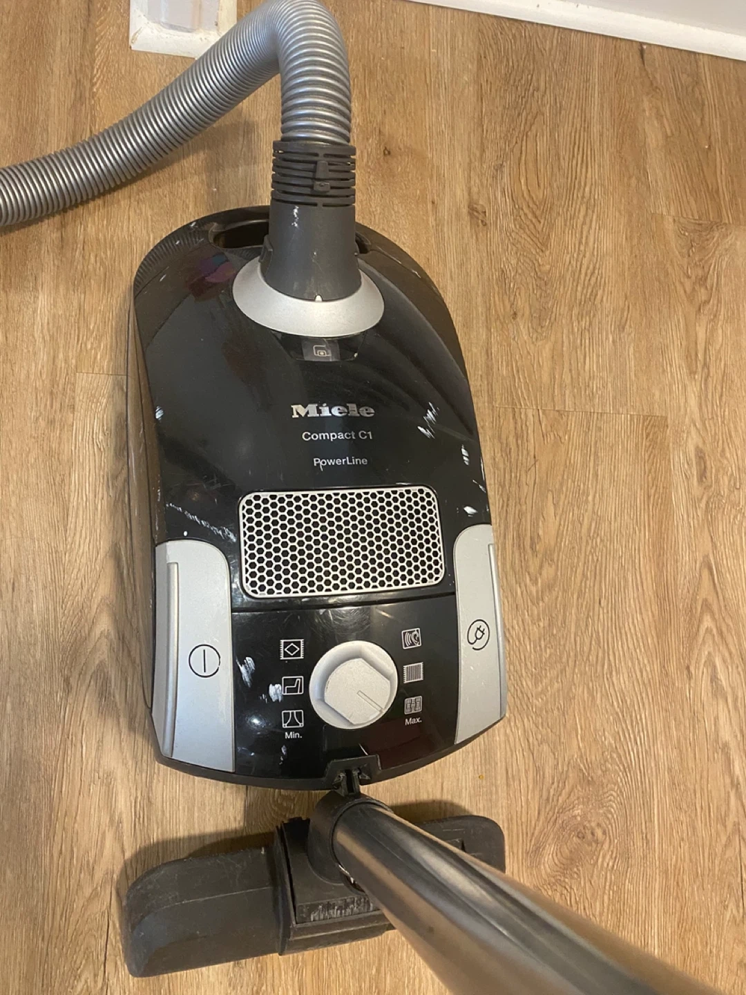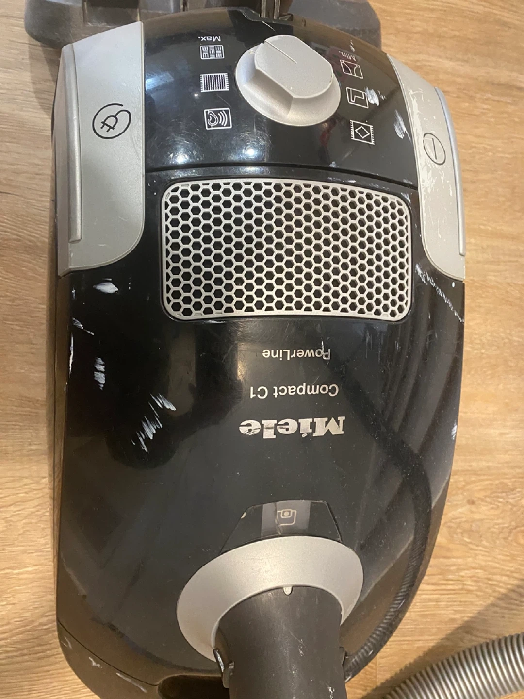 This is a Miele Compact C1 PowerLine bagged canister vacuum cleaner. It is about 10 hrs old and was well used and taken care of. Regular change of bags and filters and used in a pet free home. This vacuum still works, however not to the same capacity as it once did. It could also be a handy persons project to bring it back to life or for parts. Over the years it’s been banged up and scotch tape holds one of the clips in place, please refer to Al the pictures for more details.