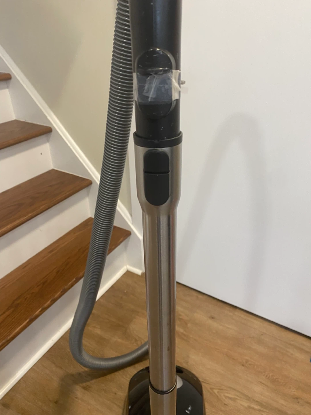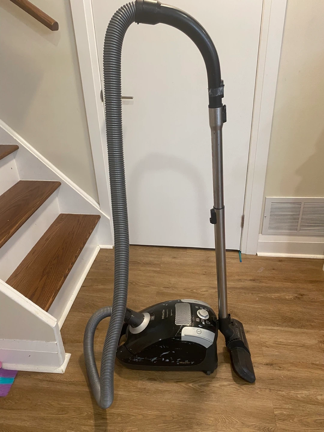 This is a Miele Compact C1 PowerLine bagged canister vacuum cleaner. It is about 10 hrs old and was well used and taken care of. Regular change of bags and filters and used in a pet free home. This vacuum still works, however not to the same capacity as it once did. It could also be a handy persons project to bring it back to life or for parts. Over the years it’s been banged up and scotch tape holds one of the clips in place, please refer to Al the pictures for more details.