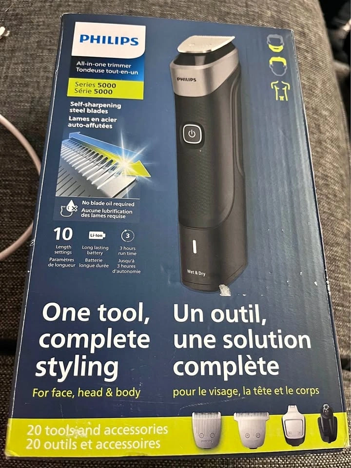This is a 20-piece men's grooming kit for beard, face, hair, and body. It includes an all-in-one shaver, beard trimmer, and hair clipper. No blade oil is needed. Model MG5910/28.
