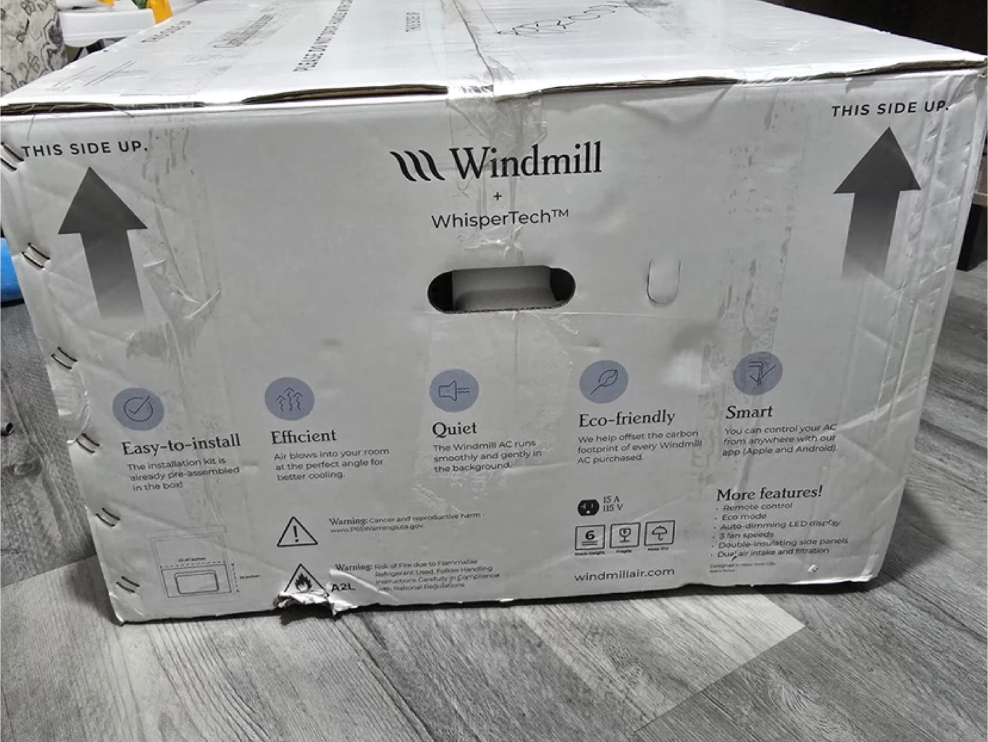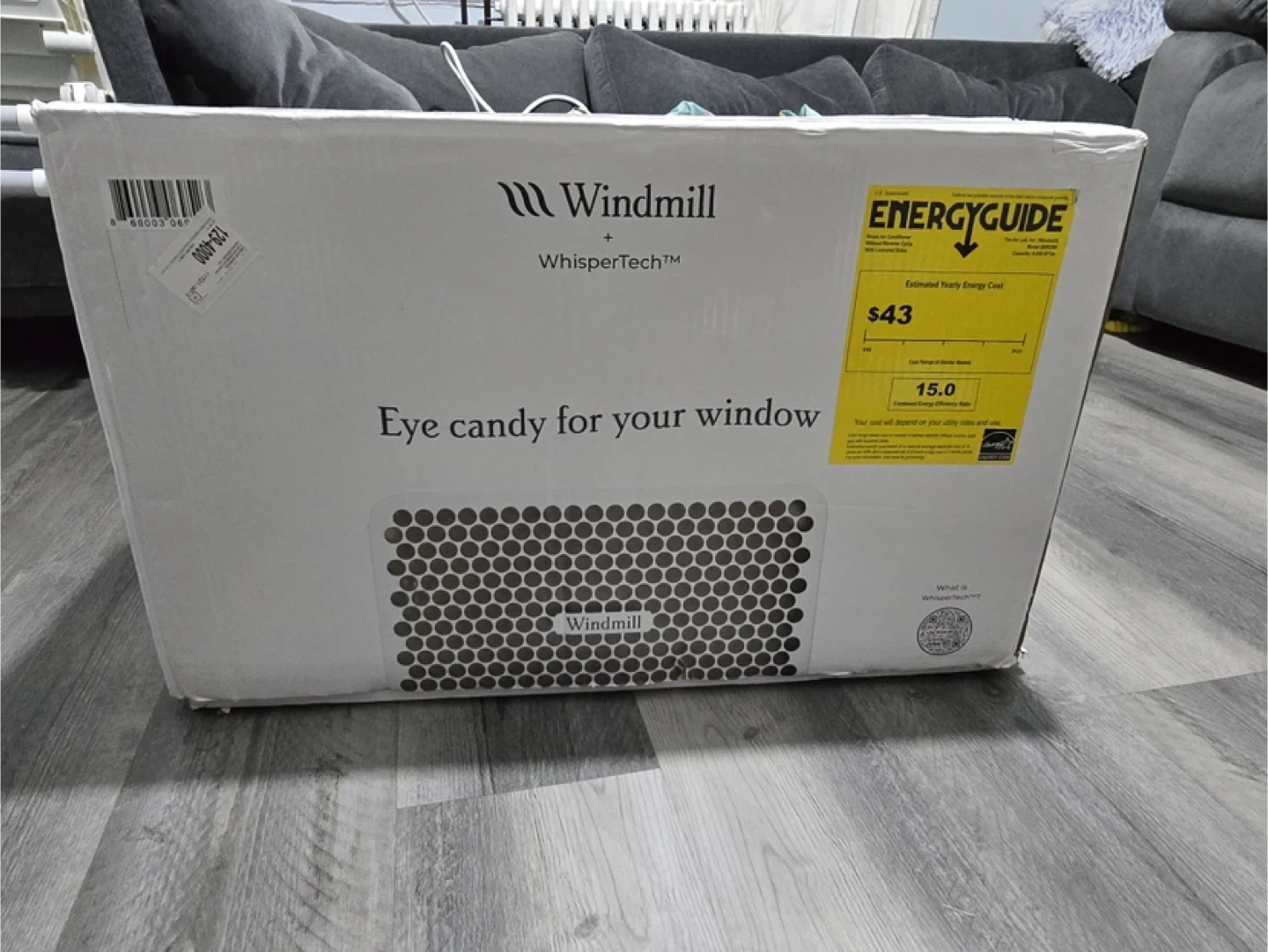 Brand new Windmill WhisperTech window air conditioner with 8000 BTU. It's designed to be quiet and eco-friendly, offering smart controls via an app. The installation kit comes pre-assembled in the box.