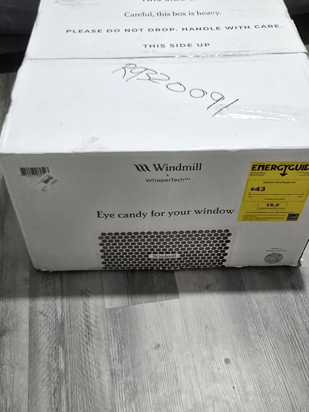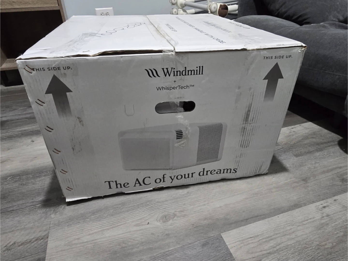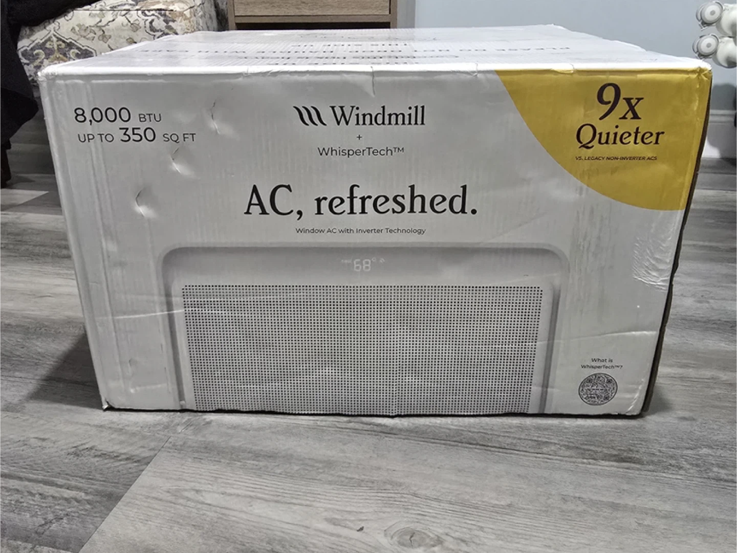 Brand new Windmill WhisperTech window air conditioner with 8000 BTU. It's designed to be quiet and eco-friendly, offering smart controls via an app. The installation kit comes pre-assembled in the box.