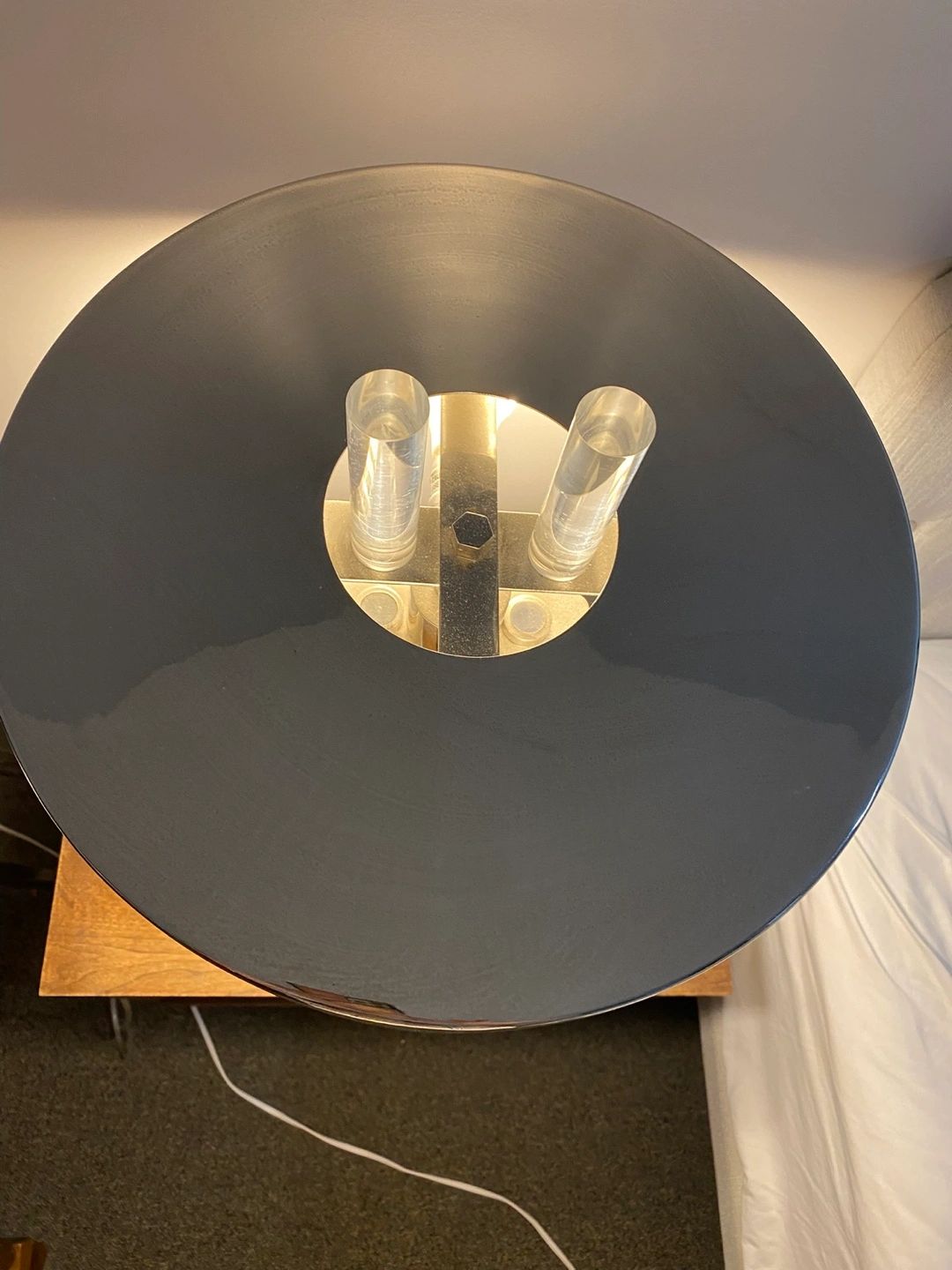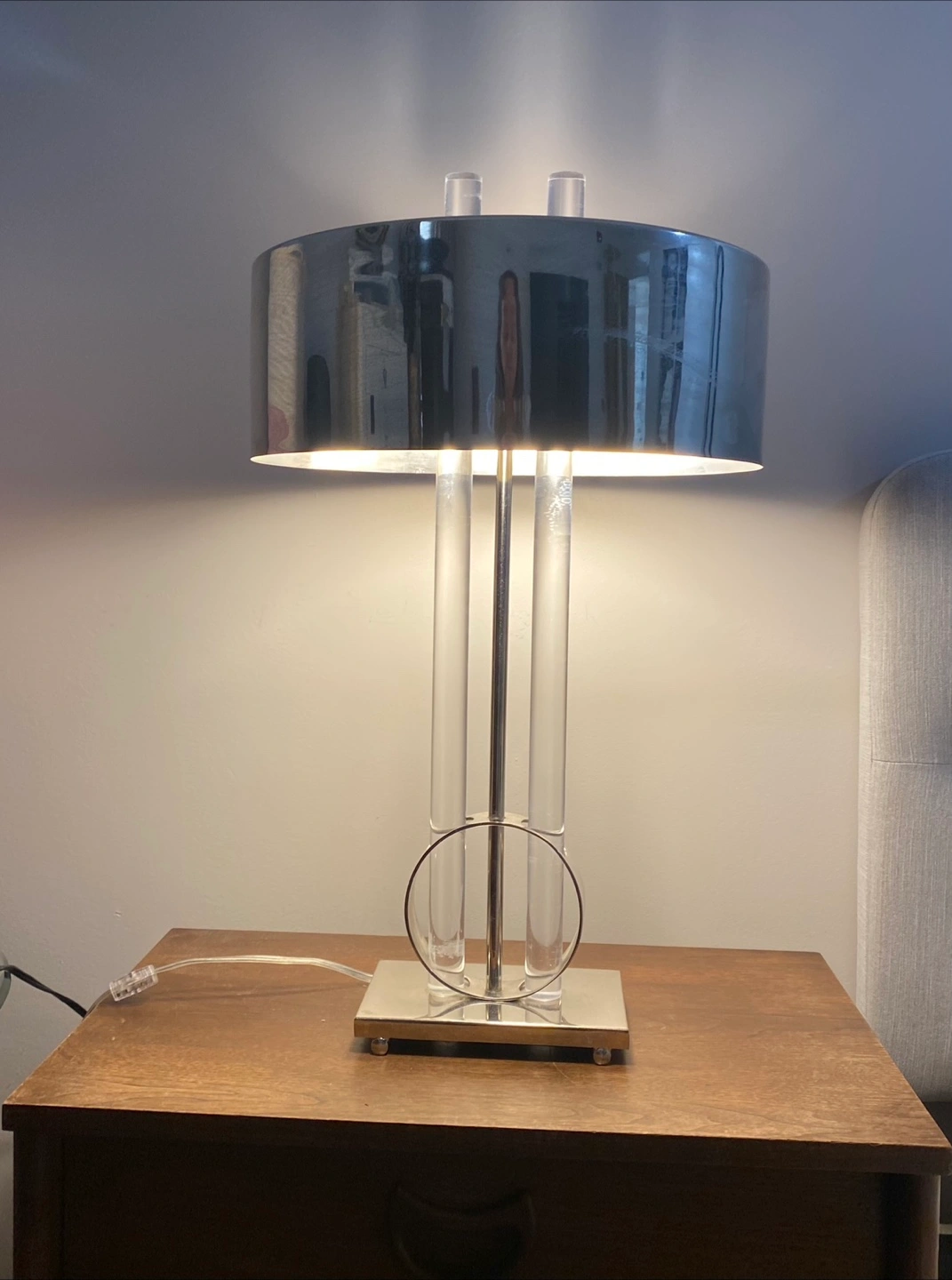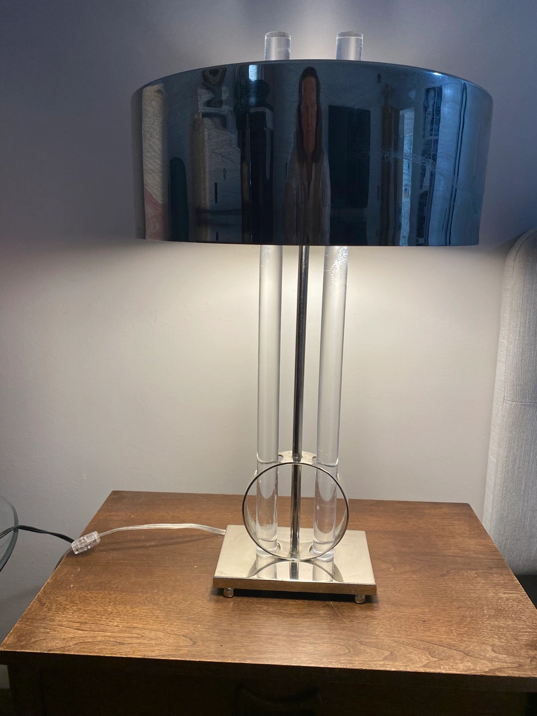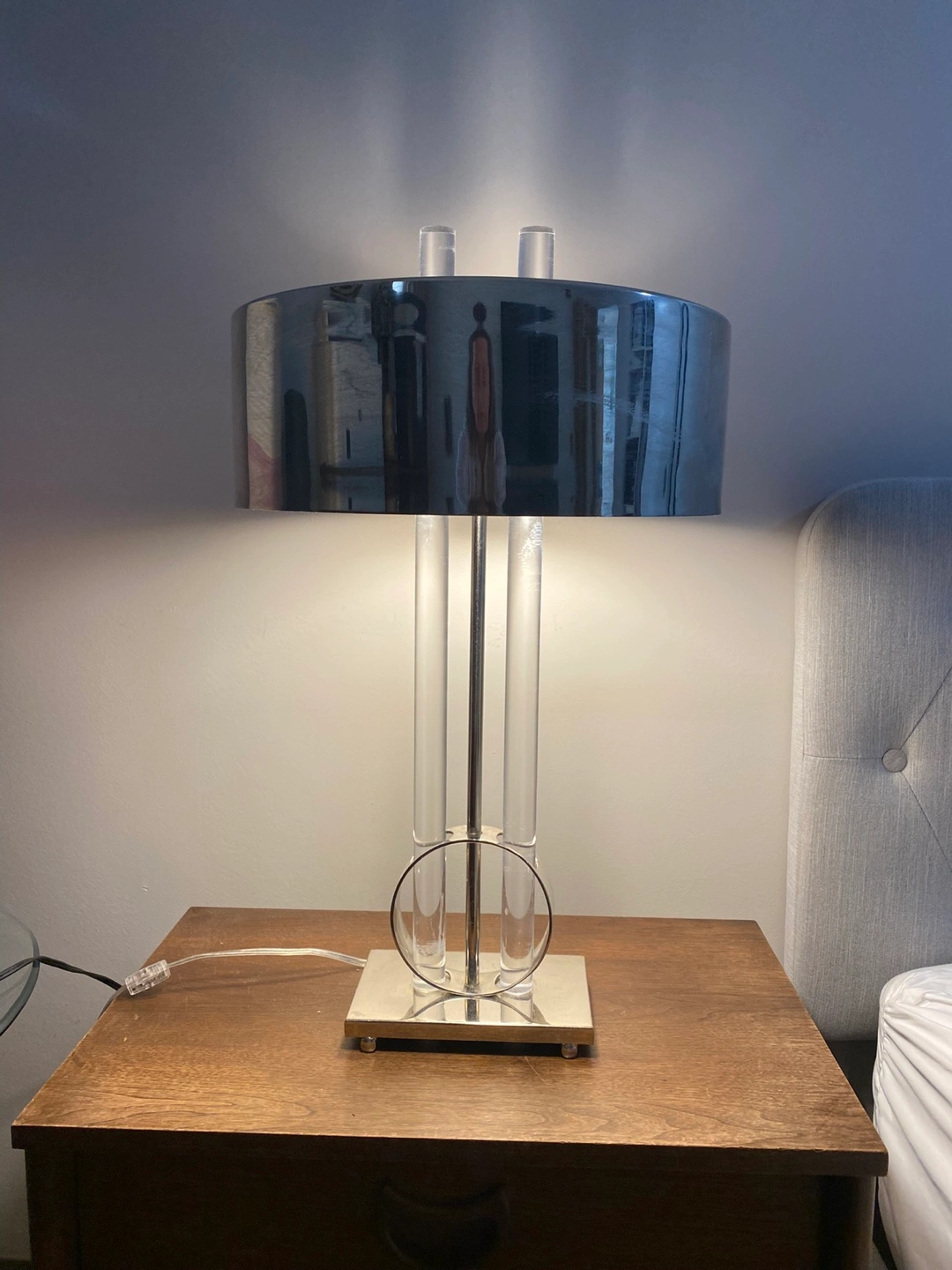 Set of modern table lamps with chrome lamp shades and clear acrylic accents! It's in great shape and would look lovely in any room