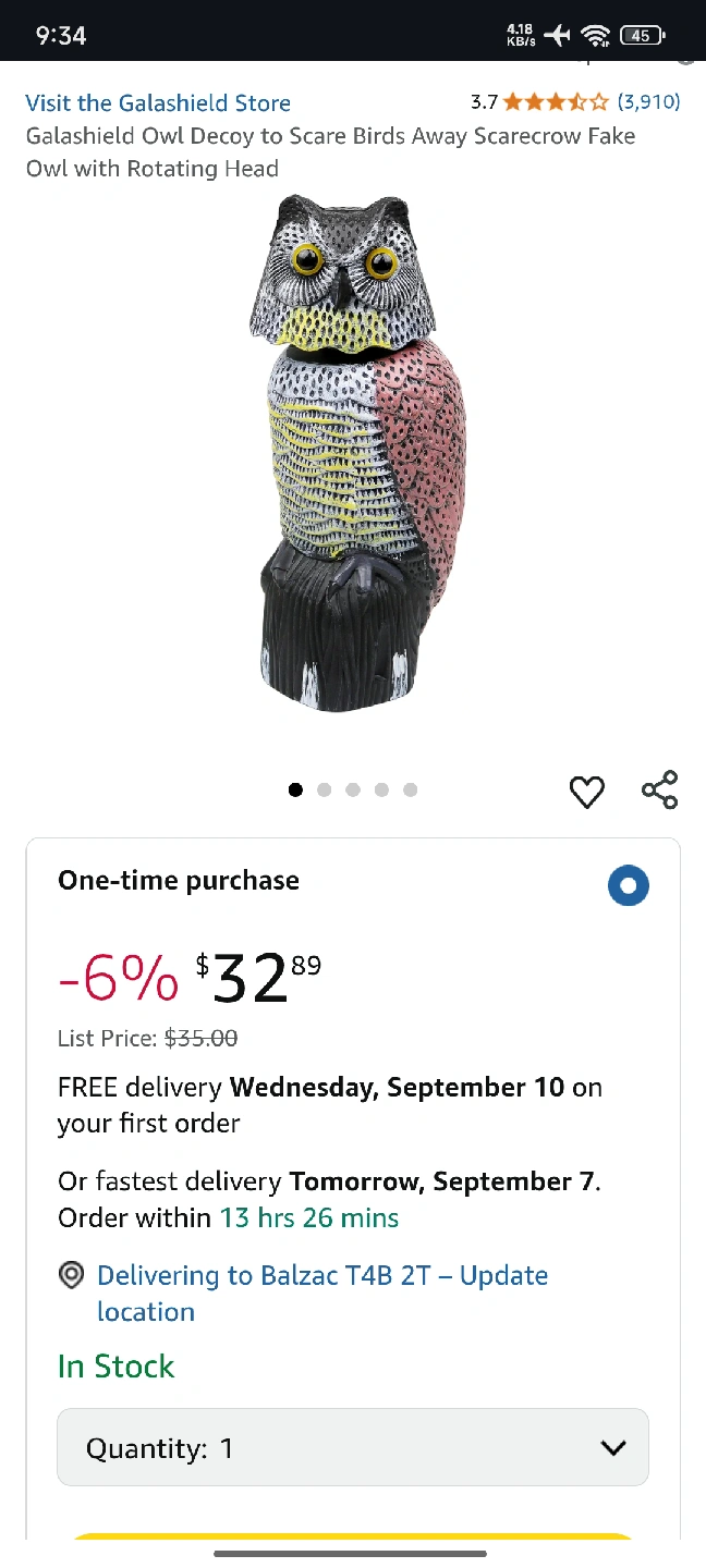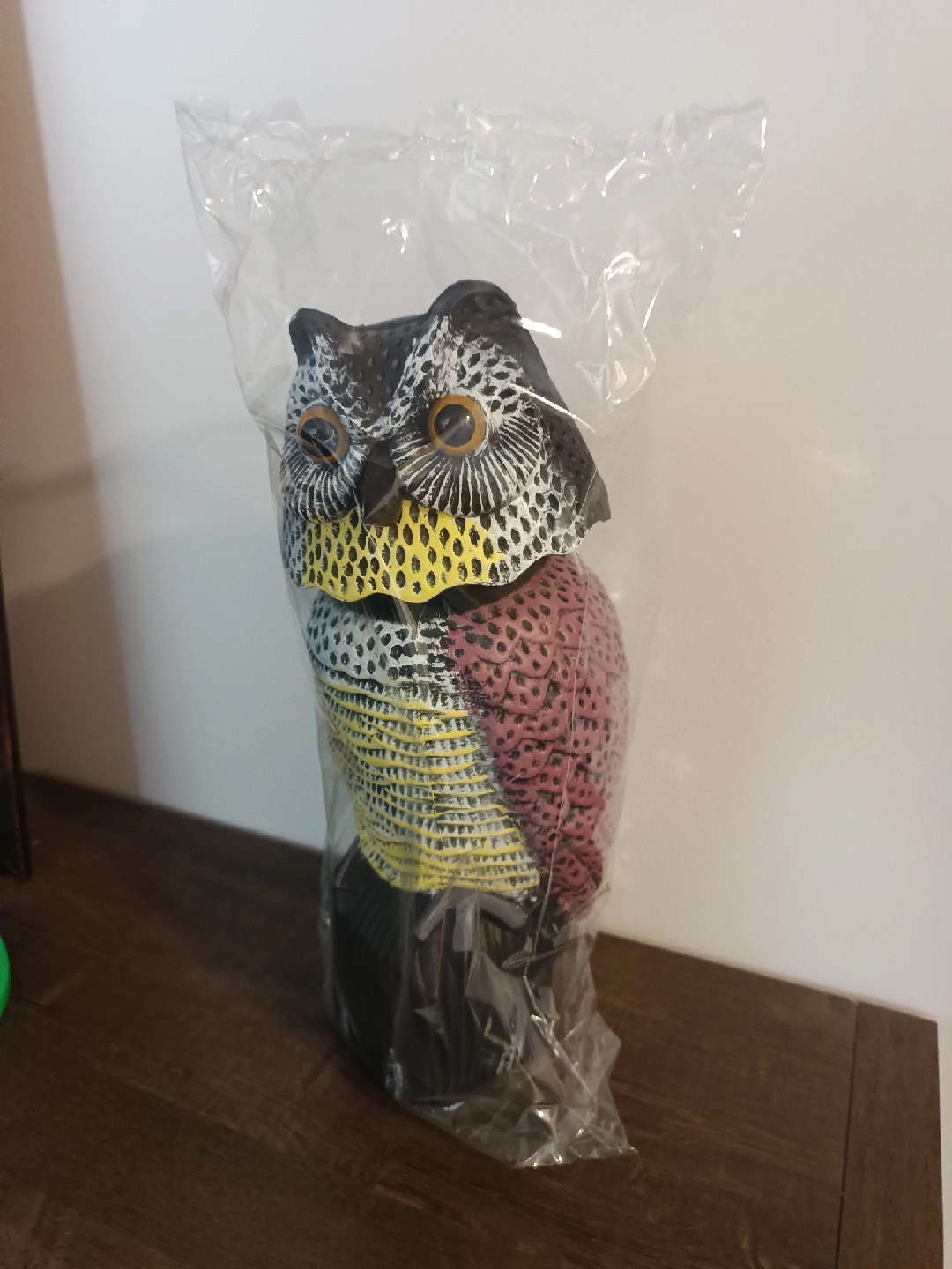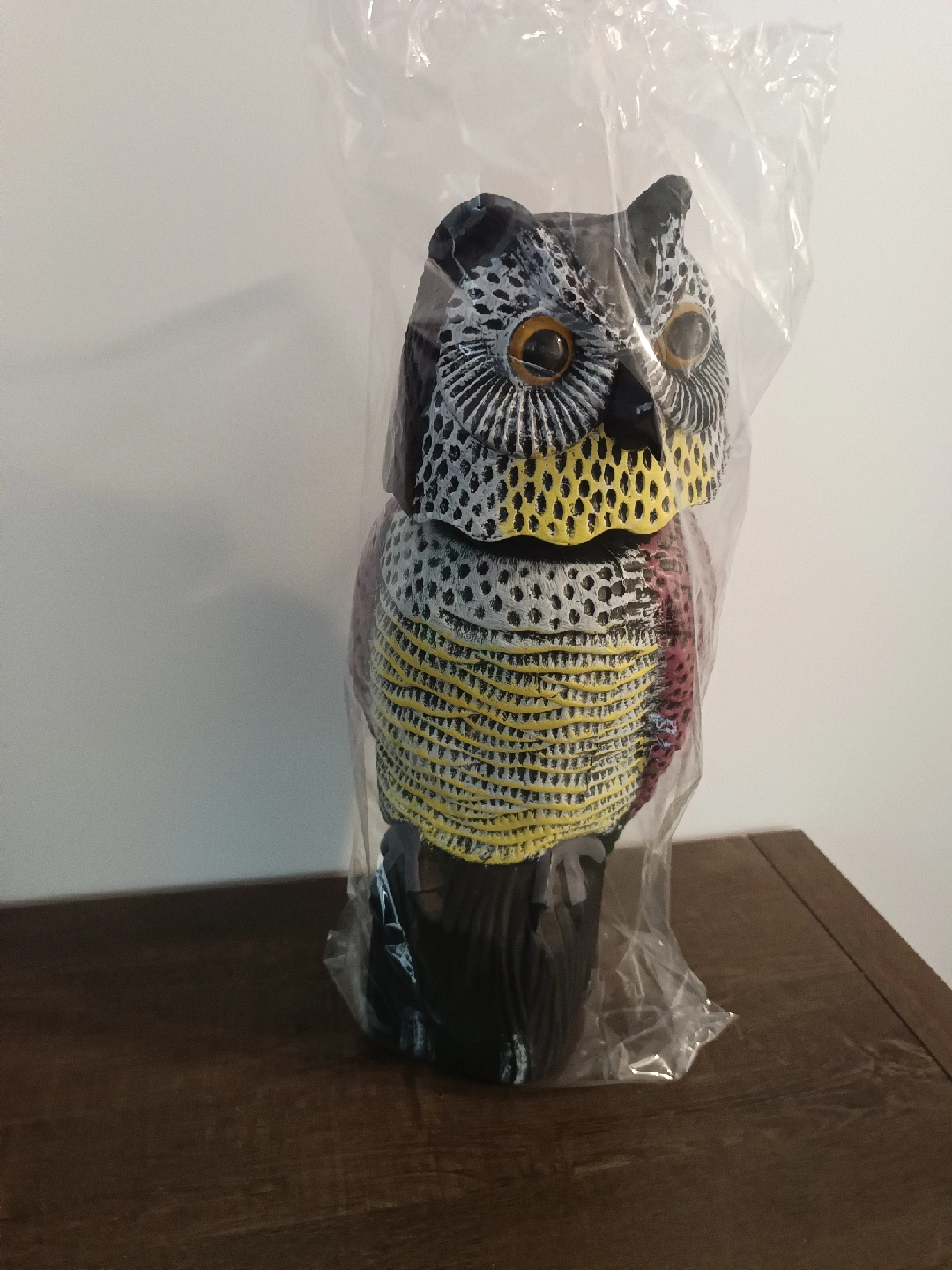 I have a brand new Galashield Owl Decoy to Scare Birds Away! It's a fake owl with a rotating head. It's still in its original packaging, never been opened. Bought 2 but only needed one so selling this one. Good for balcony or backyard. Pick up in Brighouse.