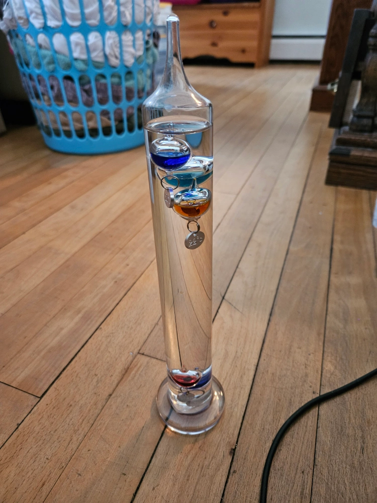 Glass thermometer. Features coloured glass globes. Measures temperature. Cash preferred, no holds, must pick up, no price negotiation at the door