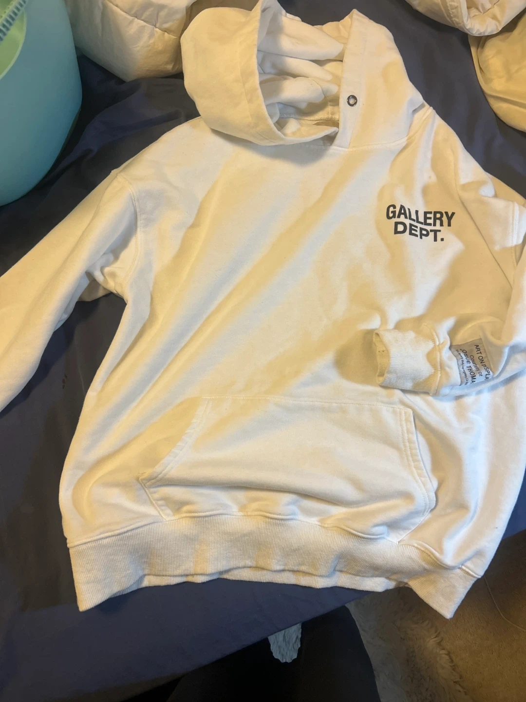 20Selling a dupe Gallery Dept. hoodie in white. It features the Gallery Dept. logo on the front and back, with "HOLLYWOOD, CA." printed below the back logo. The material is soft and comfortable, perfect for casual wear. It's in great condition and ready for a new home