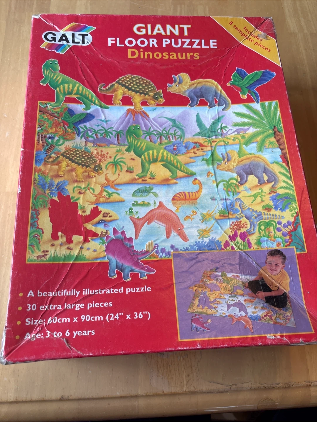 10Call 604.618.8950. Selling a Galt Giant Floor Puzzle featuring a fun dinosaur theme! It includes 30 extra-large pieces, perfect for little hands. The assembled puzzle size is 60cm x 90cm (24" x 36"). Recommended for ages 3 to 6 years. It also includes 8 template pieces for added fun