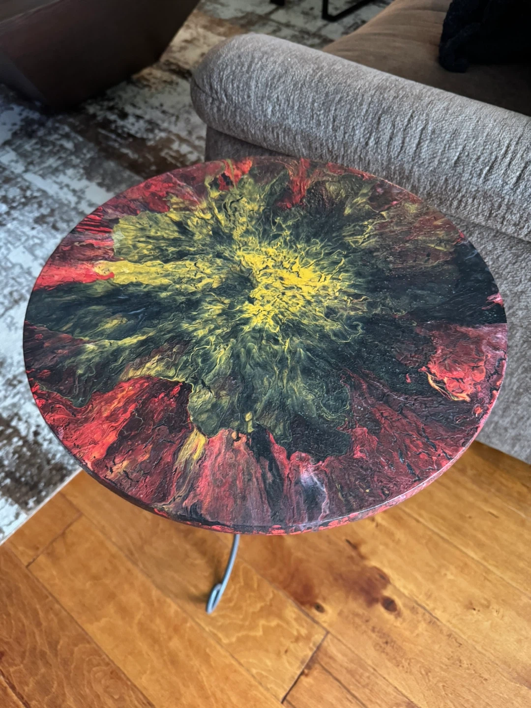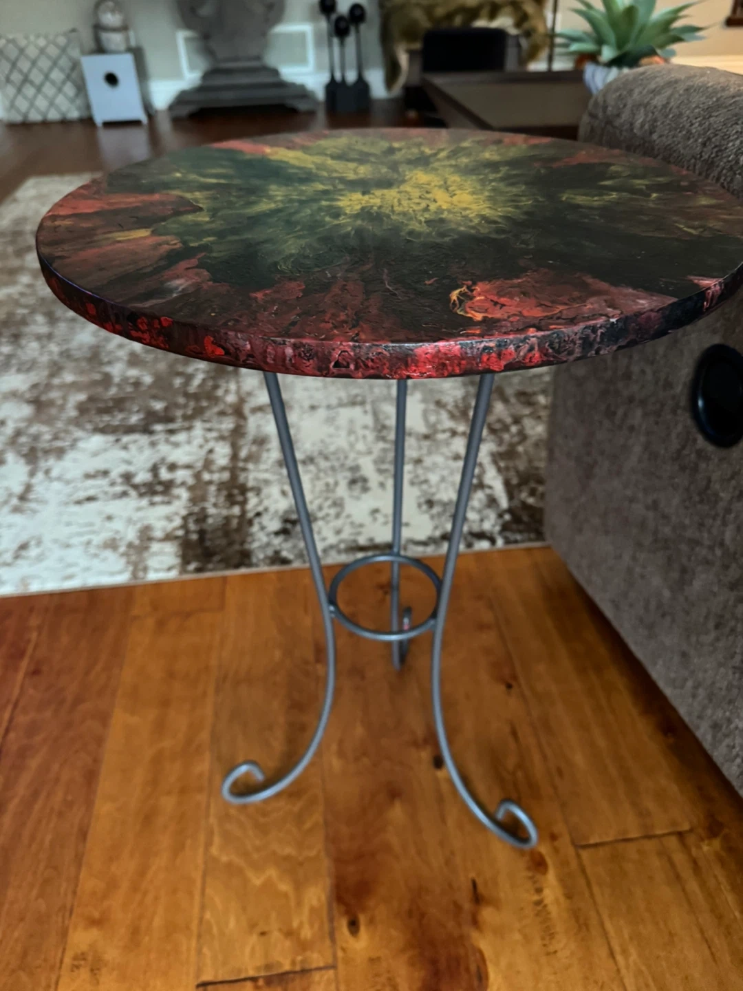 A unique round accent table featuring a vibrant, multi-coloured resin pour top. It's supported by a slender metal base with a decorative ring. This table is great for adding a pop of colour and artistic flair to any room!
