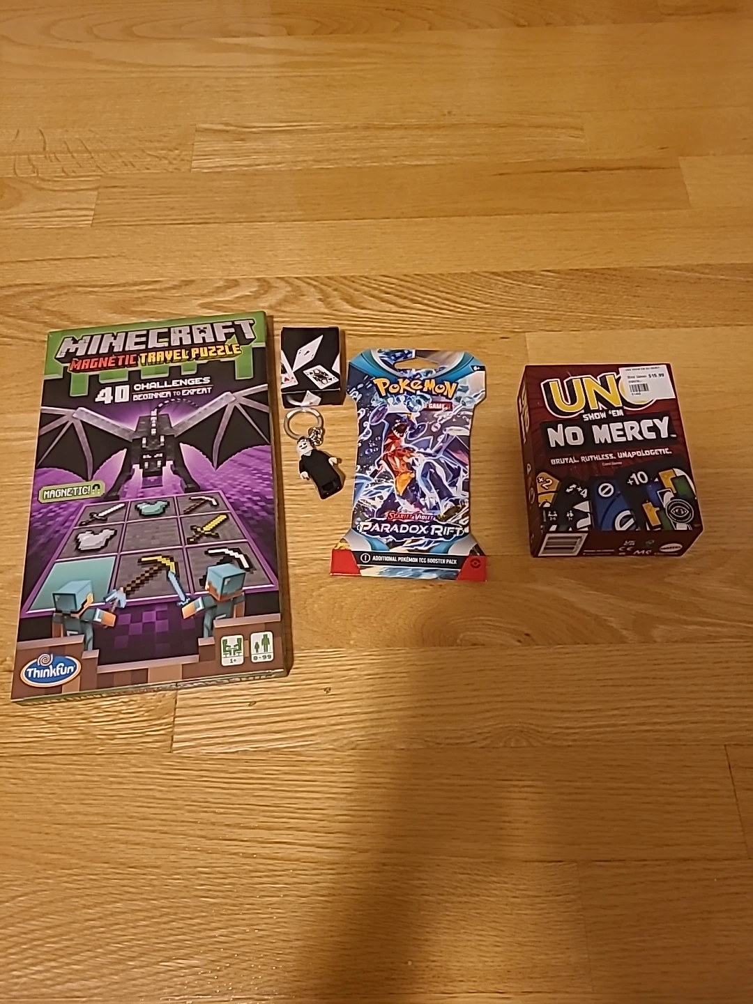10all new except the minecraft magnetics and the lego Keychain, message me any offers you have for these, individual prices : lego Keychain = 7$ cards deck = 5$ uno show em no mercy = 15$ pokemon booster pack = 10$ minecraft magnetic puzzle = 20$ all for 50$