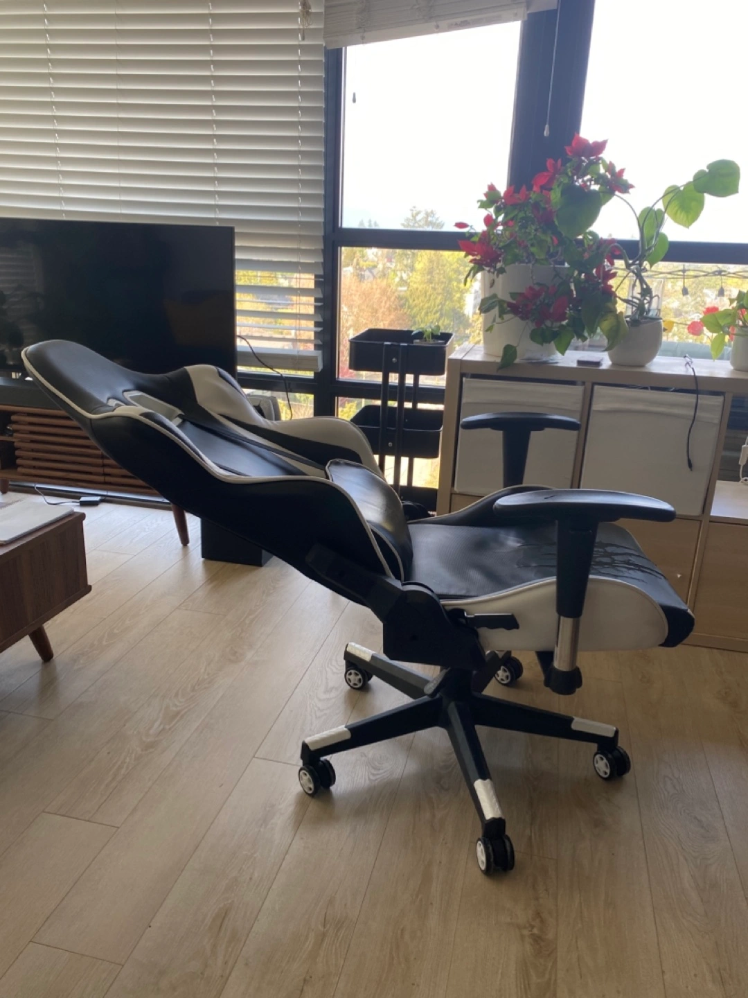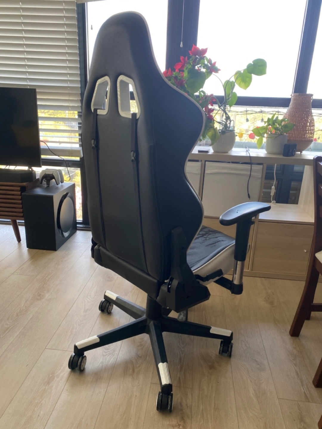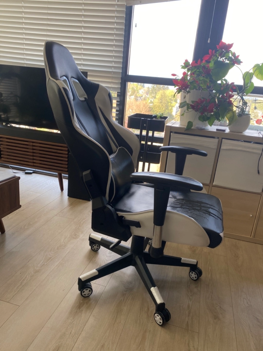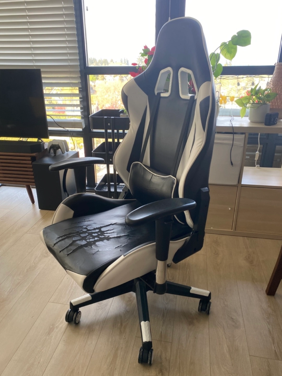 Comfortable gaming chair, black and white colour scheme. Wheels for easy mobility. Some wear and tear on the seat and the arms. Comes with a detachable lumbar support cushion. All adjustments are 100% functional: - chair height - back rest angle - arm rest height