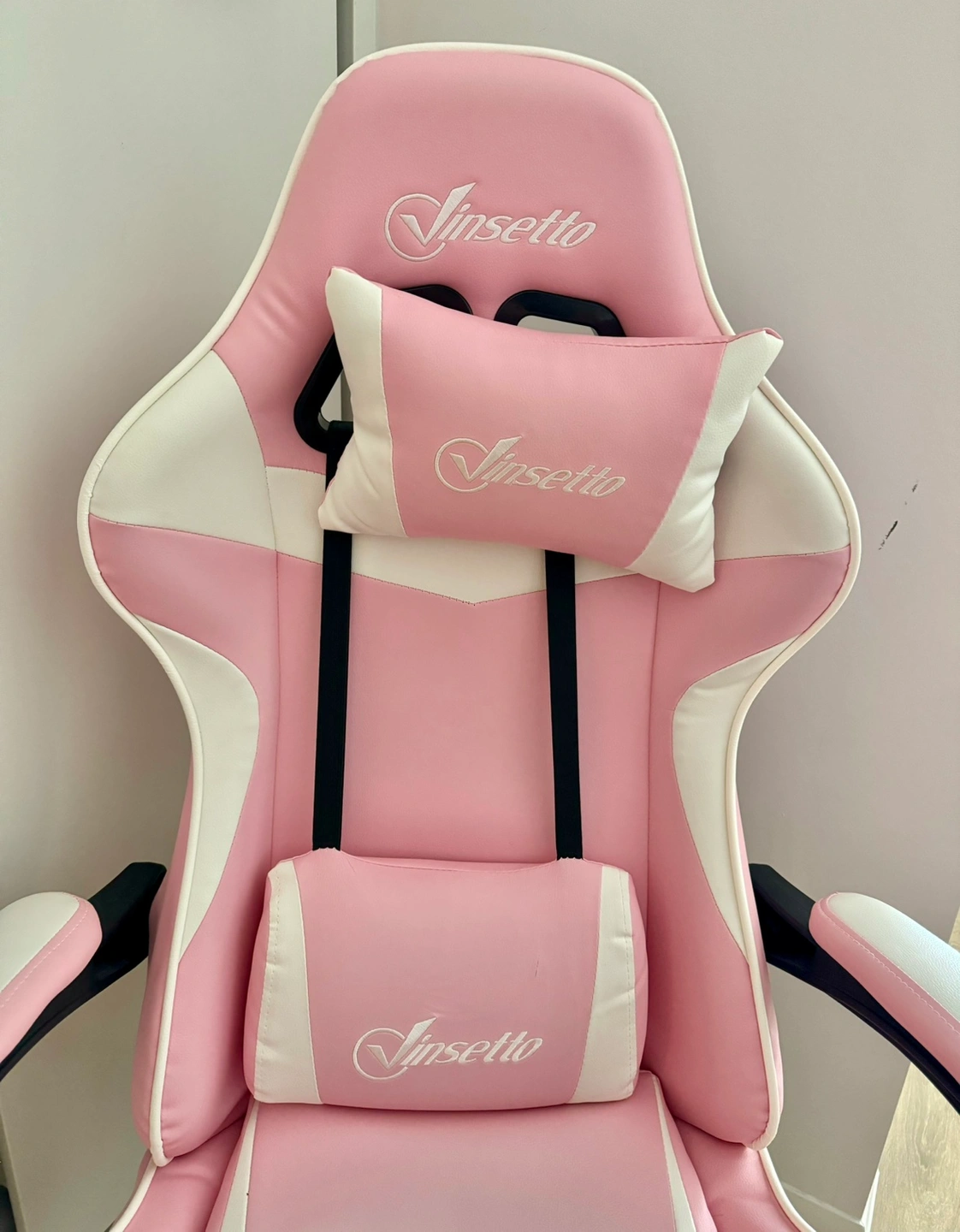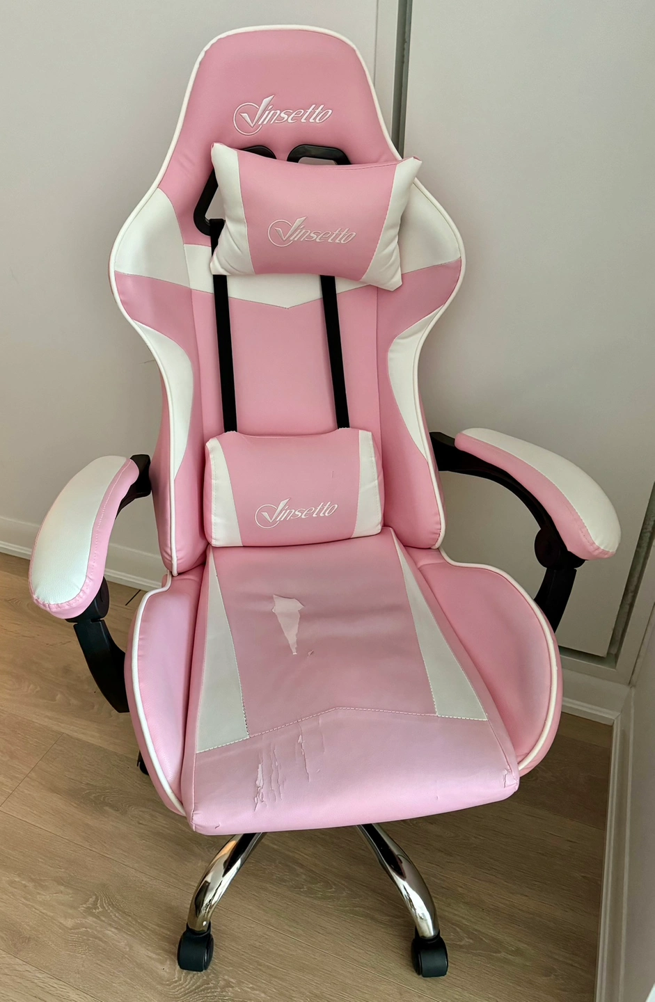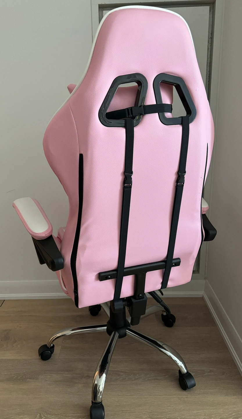 50This is a pink gaming chair with white accents. It comes with two pillows. The chair features an adjustable headrest pillow and lumbar support. It has a chrome base with wheels and a gas lift for height adjustment. I bought it from Amazon for $170. A few stretches on the seat but perfectly functional.