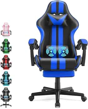 Comfortable gaming chair with massage function, adjustable height, and lumbar support.