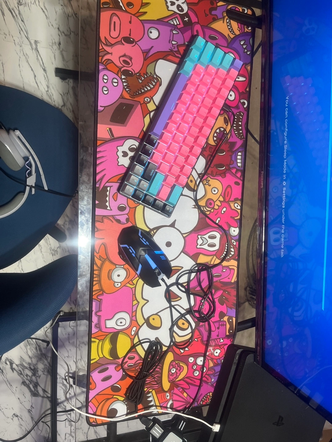 A keyboard with two colour keys and a mouse, as well as a gaming mat. All of it makes for a lovely experience if you enjoy a peaceful time playing games.