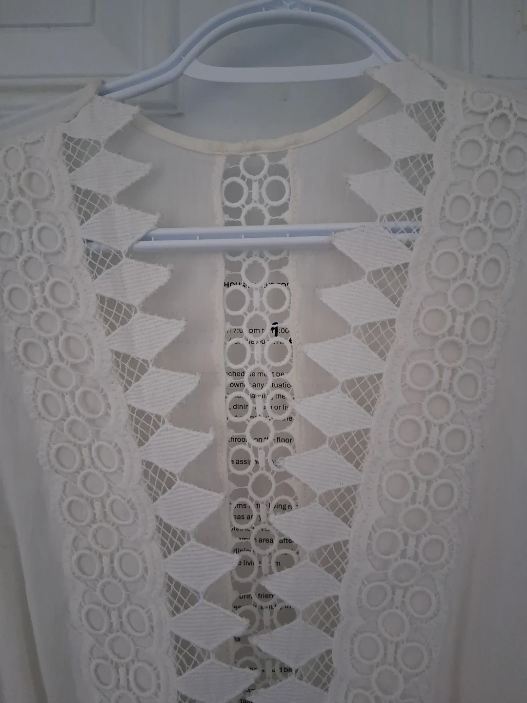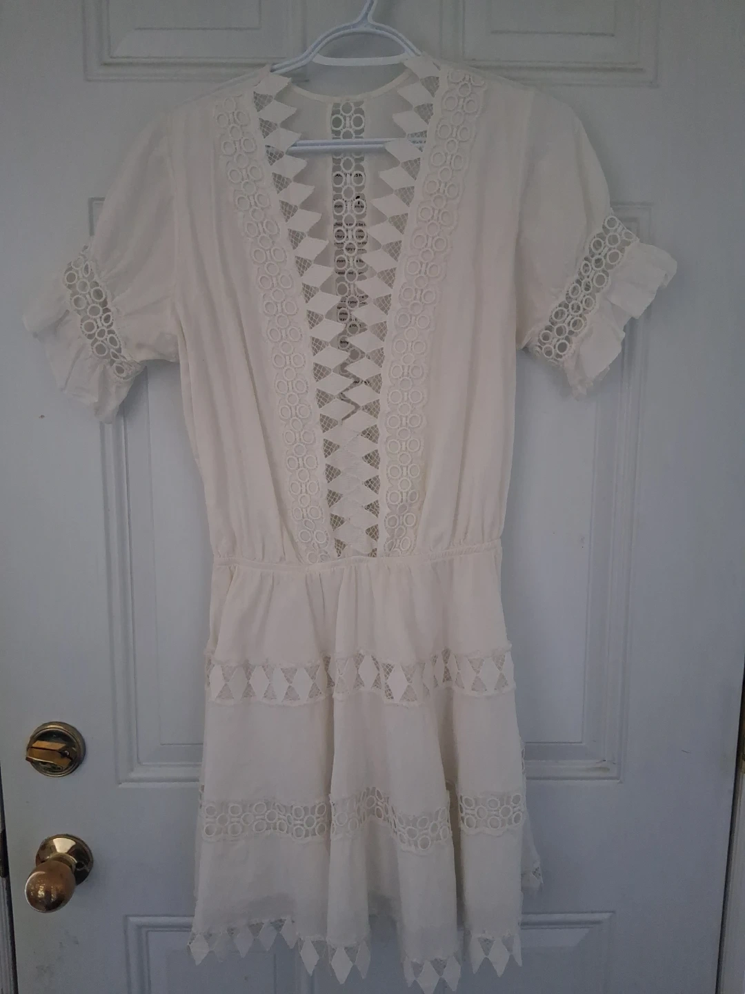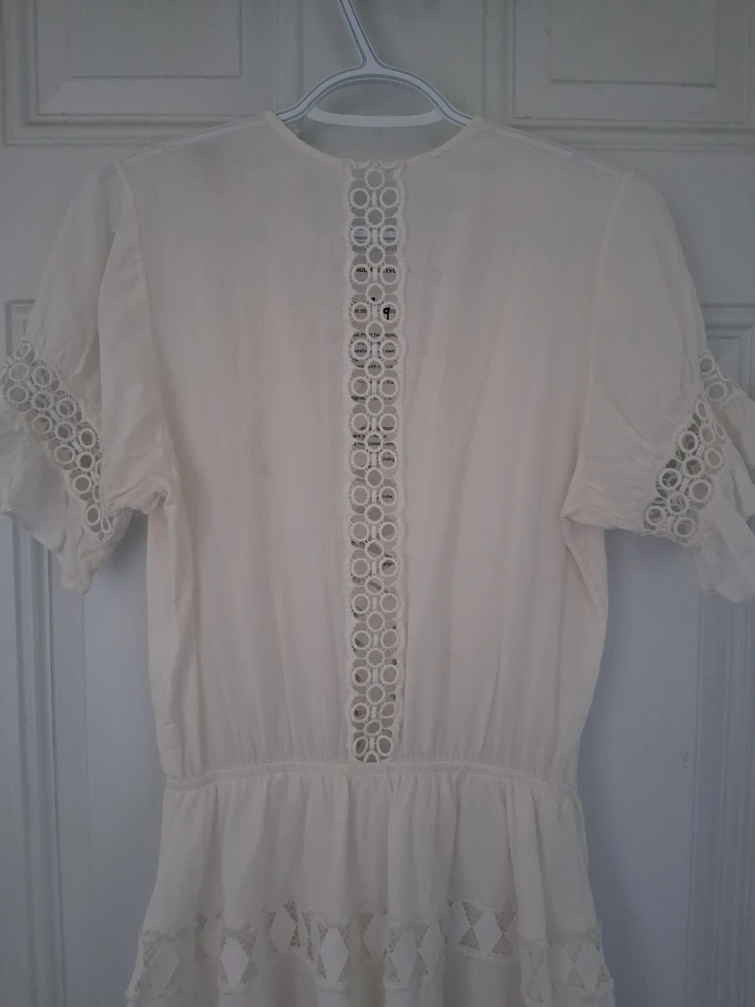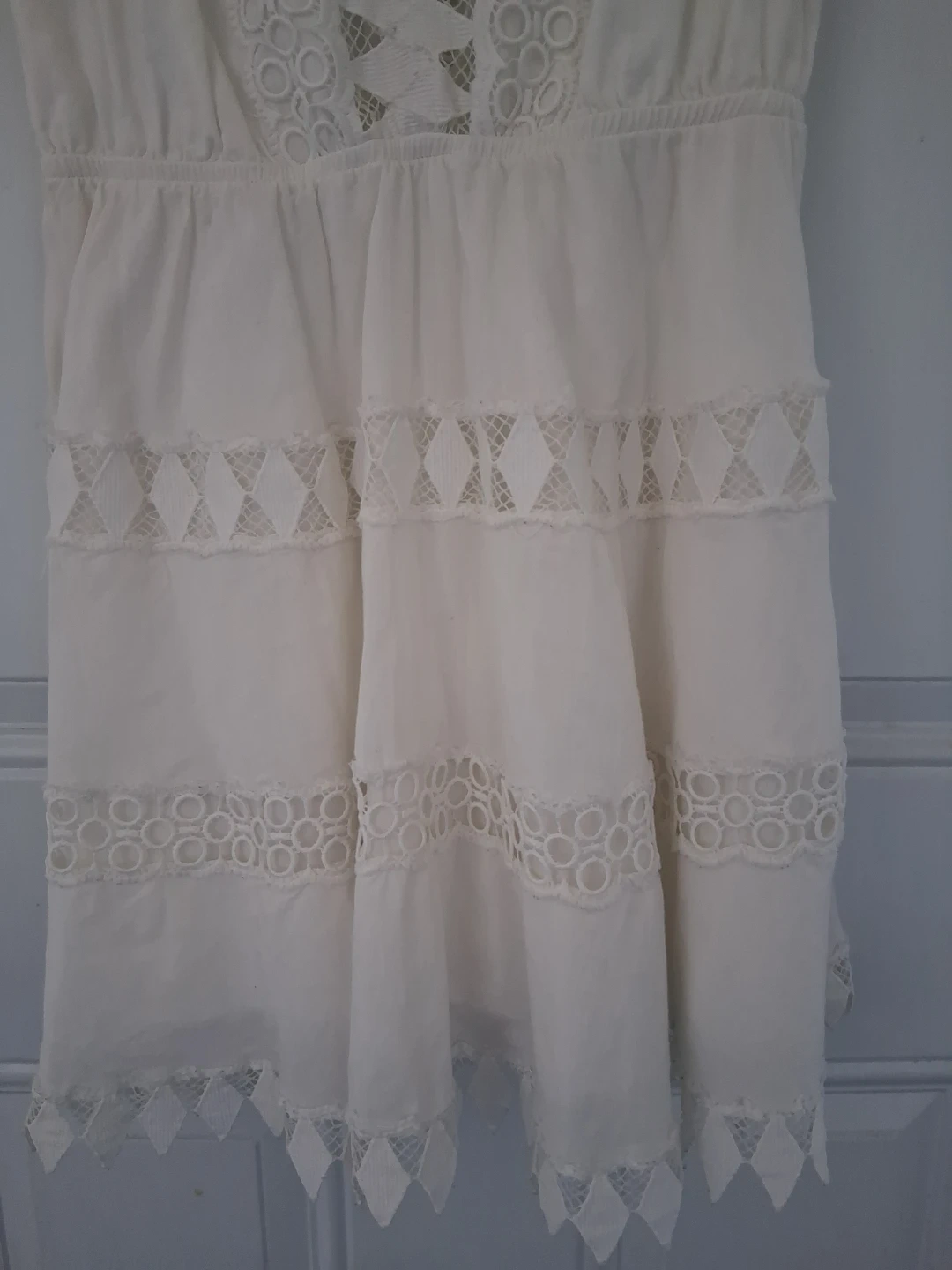 Pretty cream mini dress with delicate lace trim and eyelet details. Tiered skirt and gathered waist. Short puff sleeves with ruffled cuffs. Perfect for a summer day!