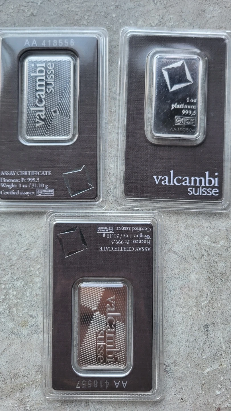 Three 1 oz Valcambi Suisse platinum bars, each with 999.5 fineness. Each bar comes in its original assay certificate packaging. Weight is 1 oz or 31.10 g.