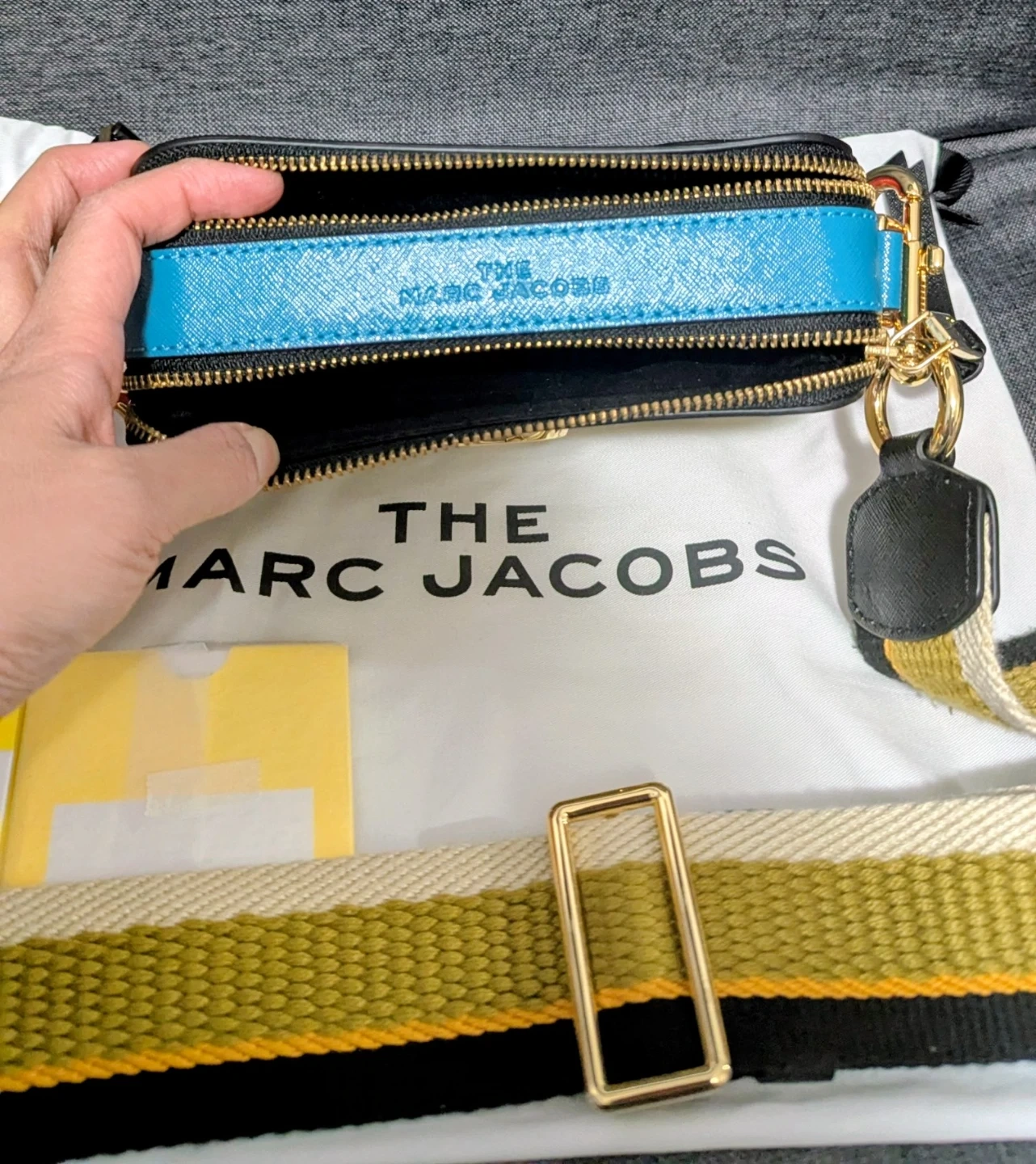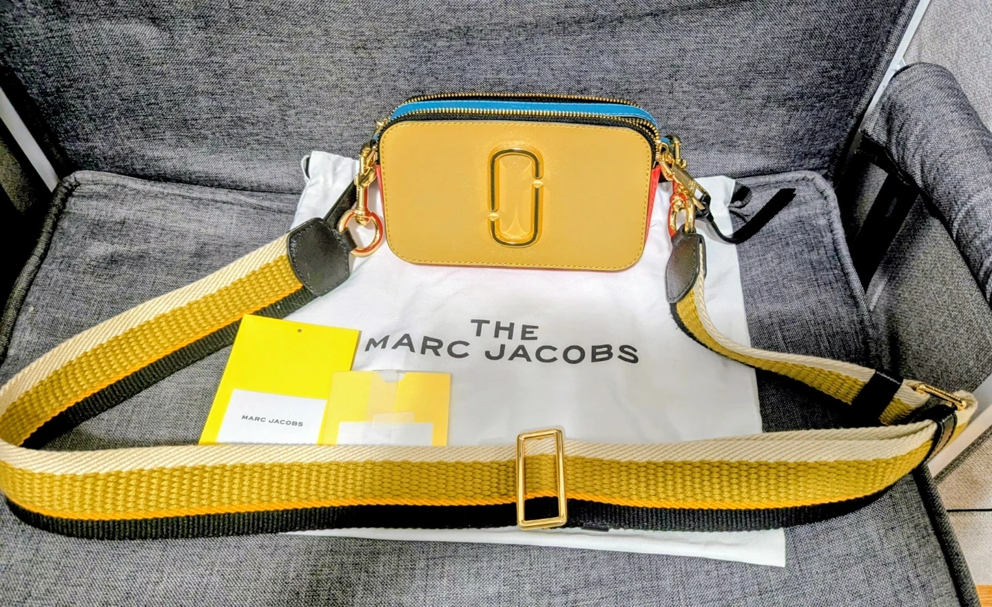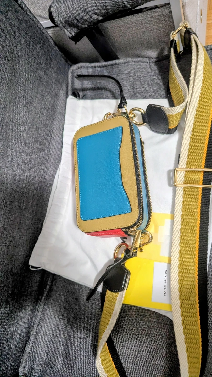 This is a The Marc Jacobs Snapshot camera bag. It features a multicolour leather exterior with gold hardware and a detachable woven strap. Includes dust bag.