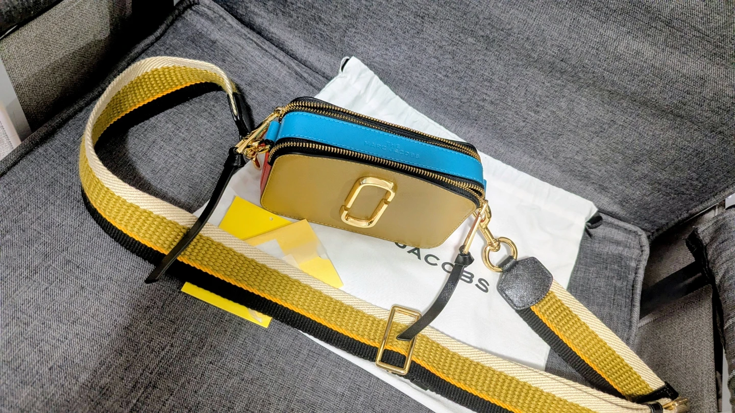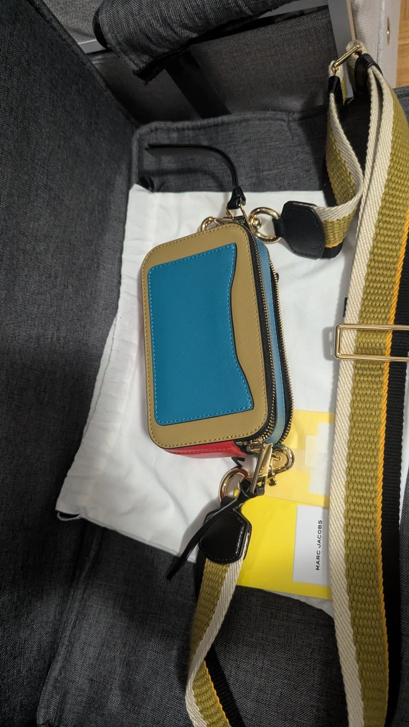 This is a The Marc Jacobs Snapshot camera bag. It features a multicolour leather exterior with gold hardware and a detachable woven strap. Includes dust bag.