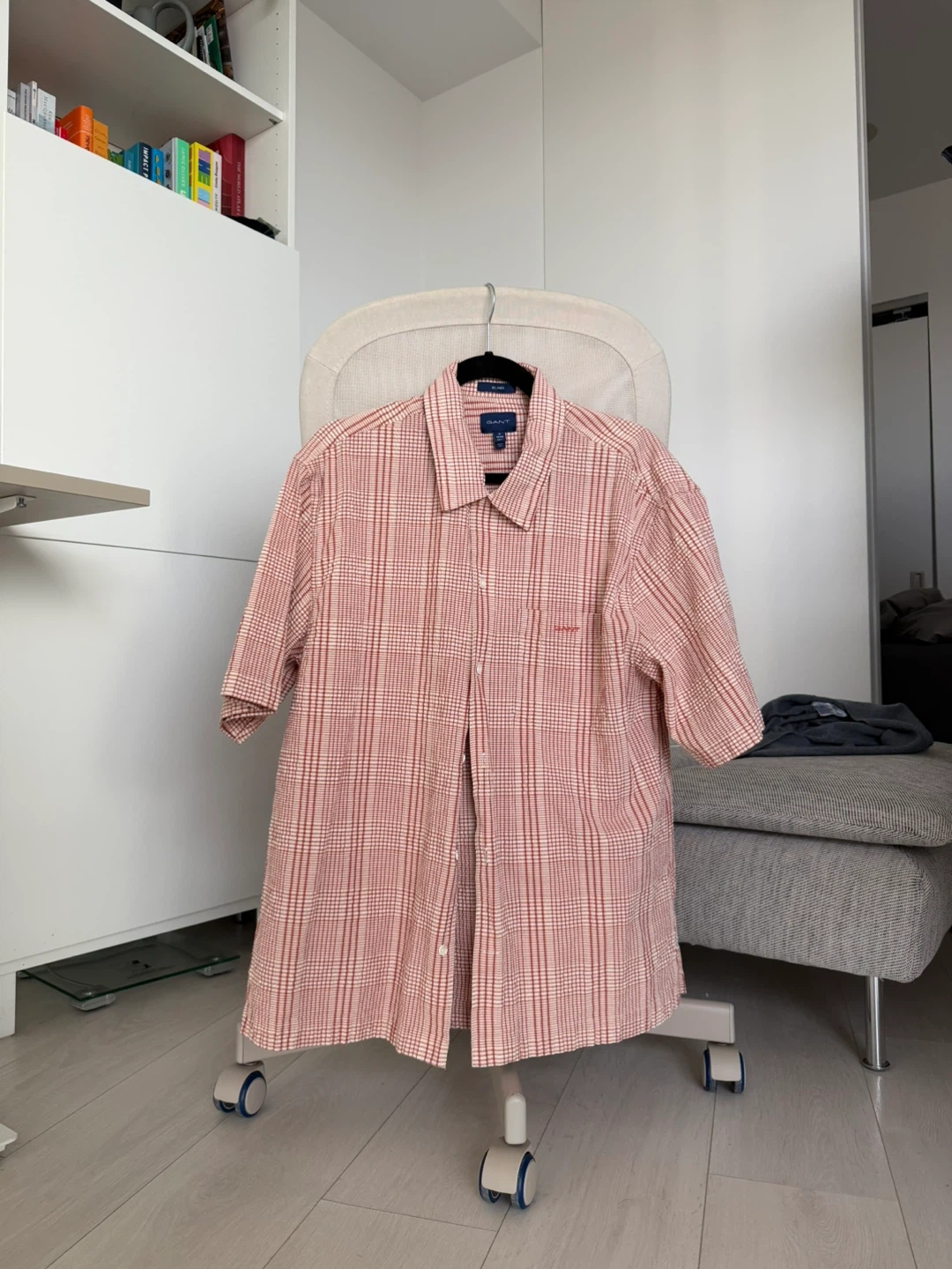 22Please note* Size labelled as medium and 39/40 15 But I usually wear dress shirt 42 16.5 This fits just right on me (I m 6’2) Selling a GANT relaxed fit shirt in size medium! It features a red and white plaid pattern. The material is light and breathable, perfect for warmer weather. It's in great condition and comes from a smoke-free home