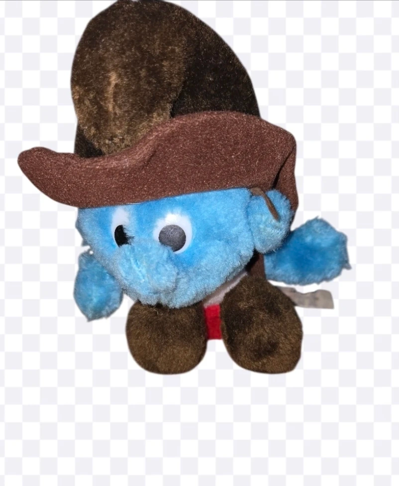 65Selling a cute Smurf plush toy from Ganz Bros! It's in great condition and ready for a new home. This little guy is wearing a brown cowboy hat and boots, with a red shirt and blue accents. Perfect for collectors or kids!