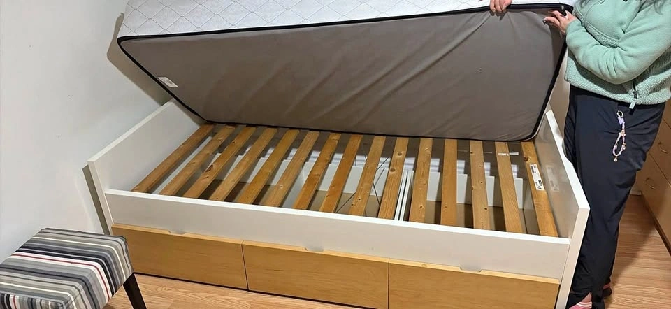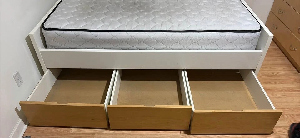 Versatile IKEA twin bed frame with three spacious storage drawers underneath, great for extra storage. Comes with a comfy Sealy mattress. Ready for pickup!