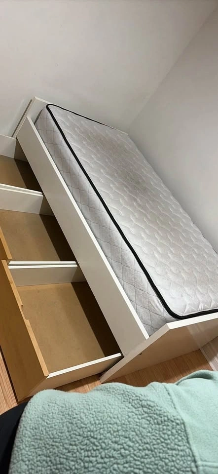 Versatile IKEA twin bed frame with three spacious storage drawers underneath, great for extra storage. Comes with a comfy Sealy mattress. Ready for pickup!