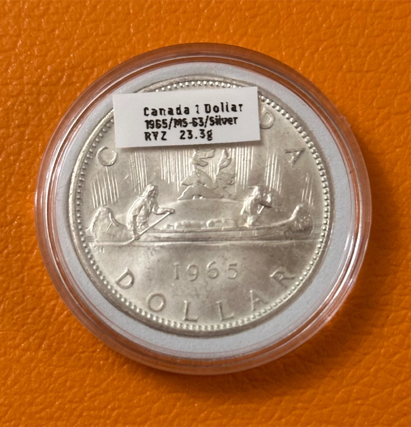 This is a authentic Canadian 1965 one dollar coin, graded MS-63 and made of silver. The coin weighs 23.3g. It features Queen Elizabeth II on one side and a canoe scene on the other. It's housed in a protective plastic case.