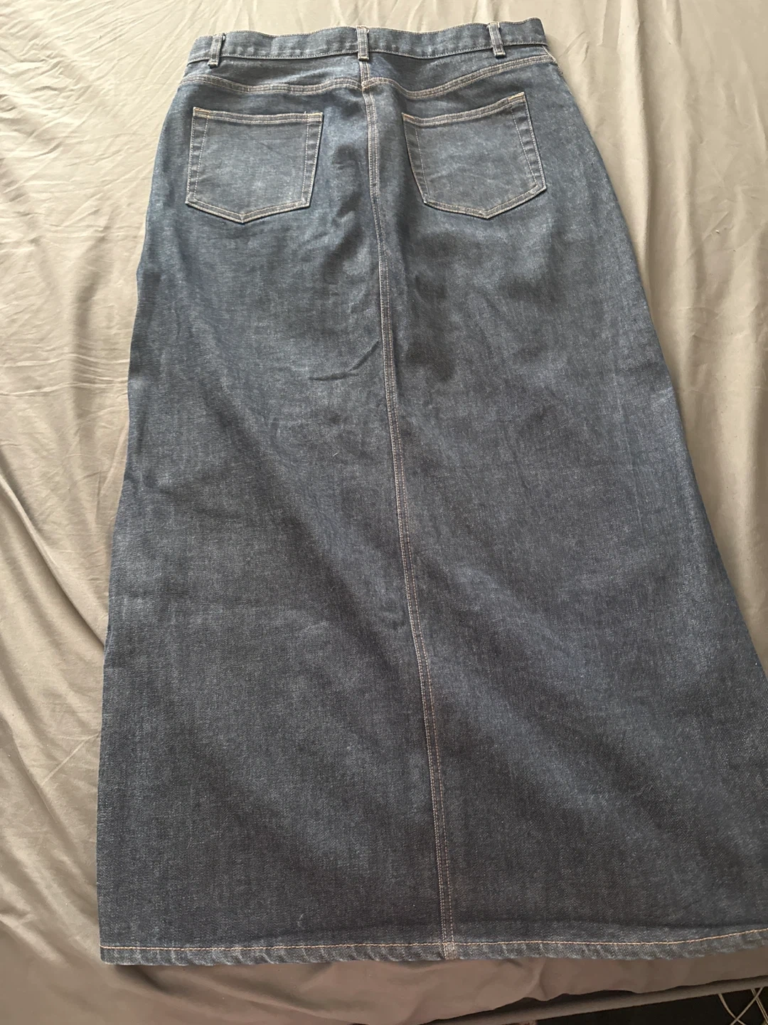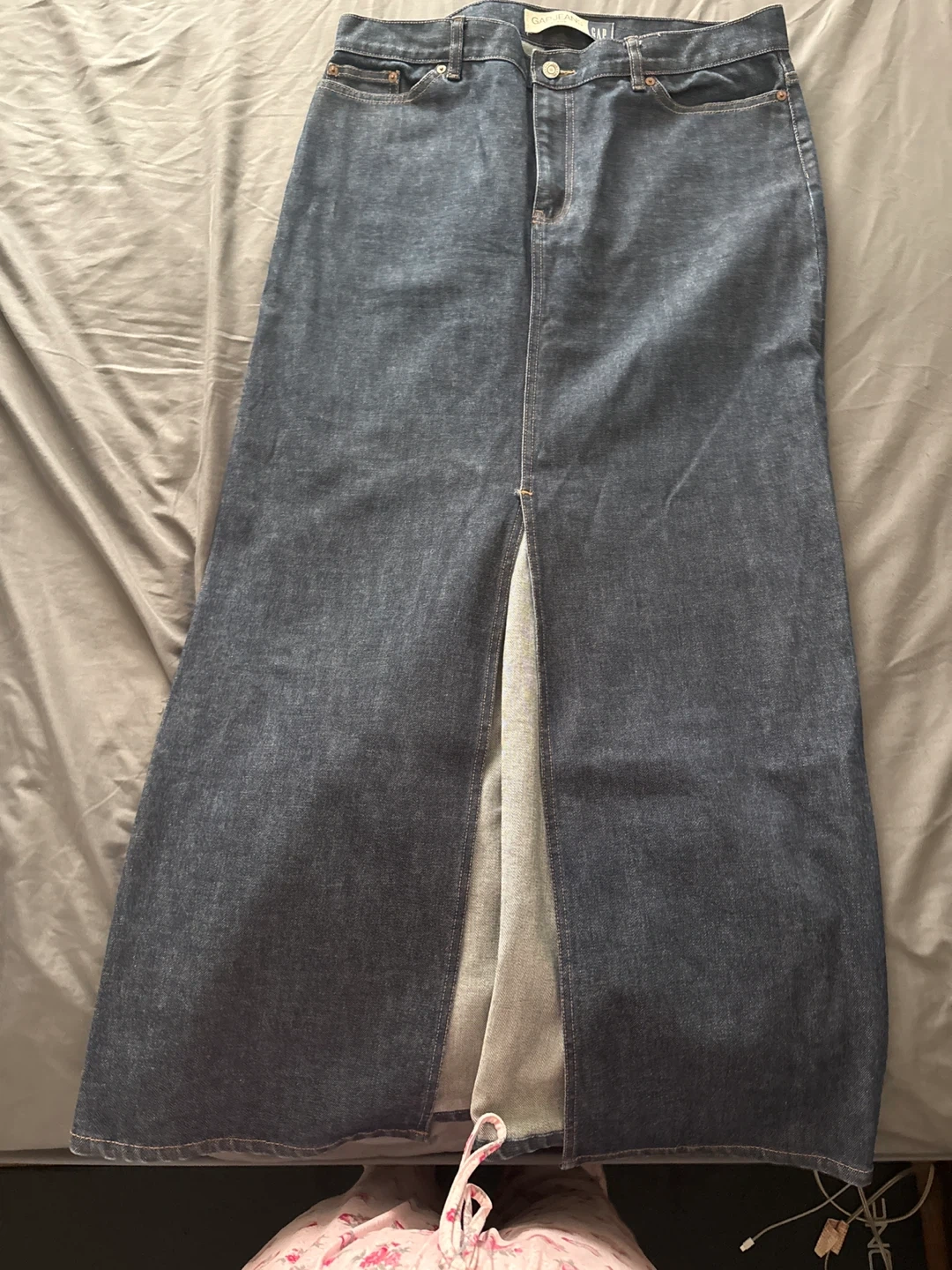 74Selling a stylish GAP Jeans denim maxi skirt! It's a beautiful dark wash denim, perfect for any season. The skirt features a flattering silhouette with a front slit for easy movement.
