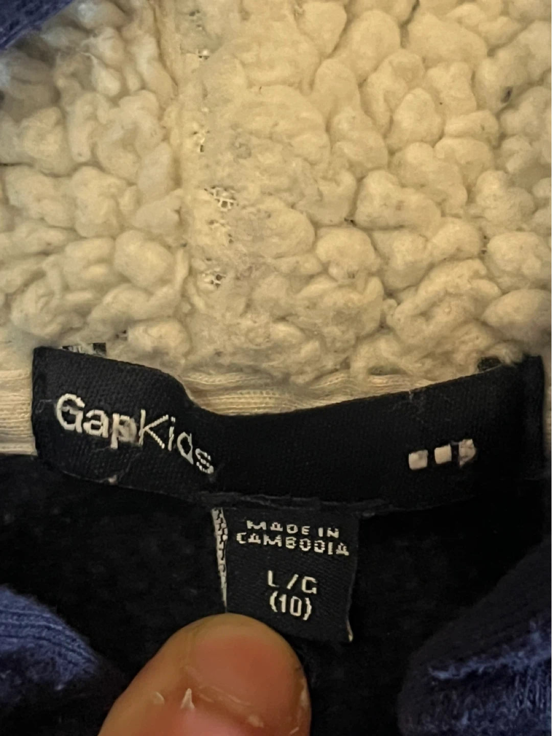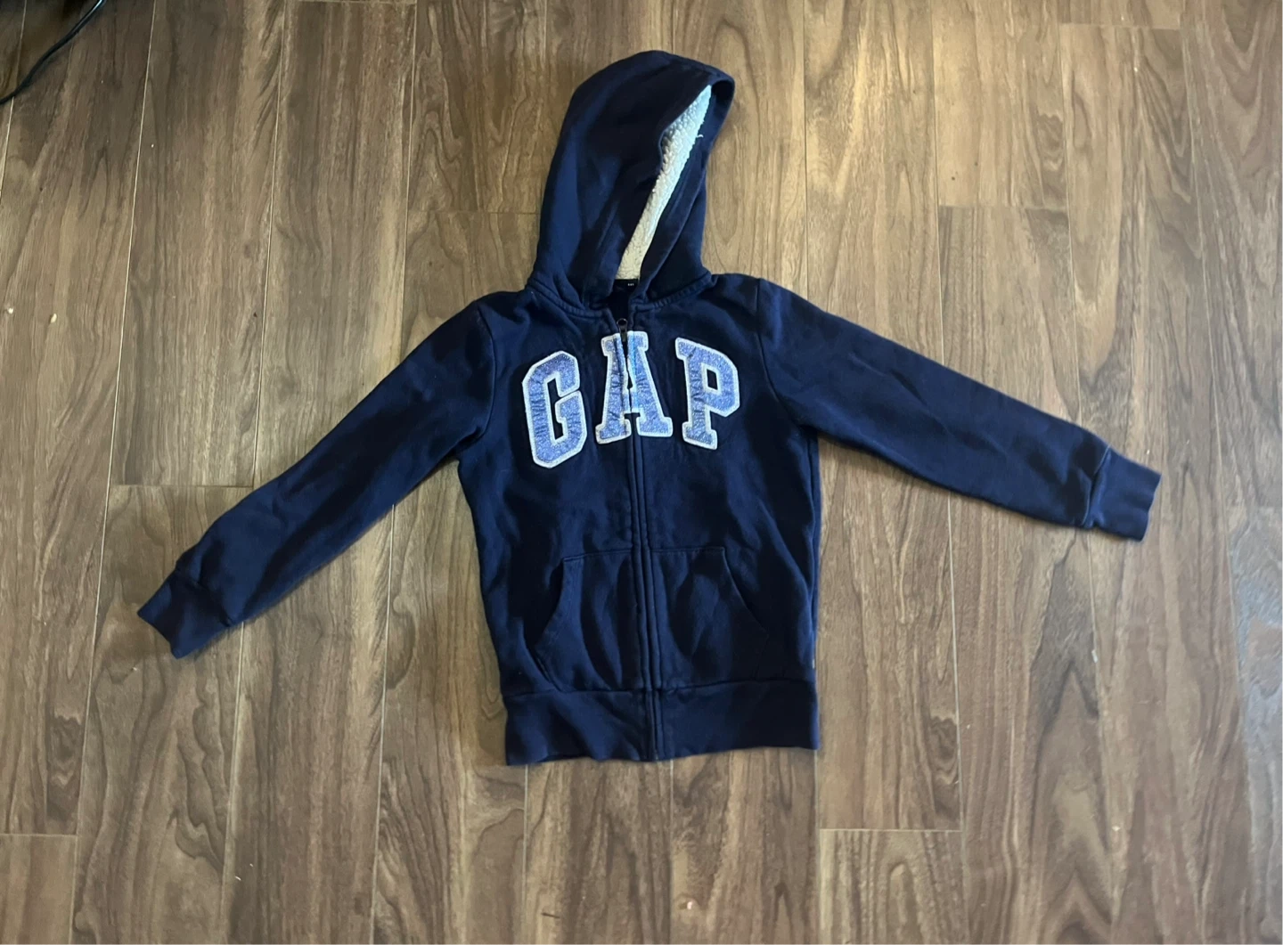 10Selling a Gap Kids zip-up hoodie in size Large (10). It's a nice navy blue colour with a sherpa-lined hood. Perfect for keeping your little one warm and cozy!