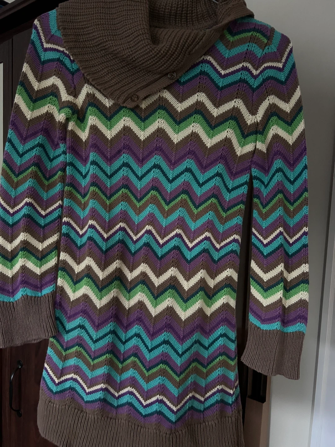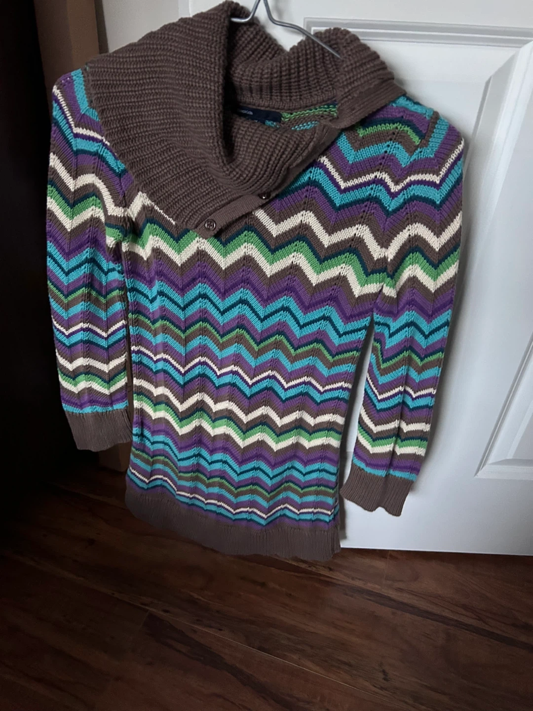 48Selling a Gap Kids chevron knit sweater in size M. It features a brown cowl neck and a colourful chevron pattern in shades of purple, green, and turquoise. Perfect for layering!