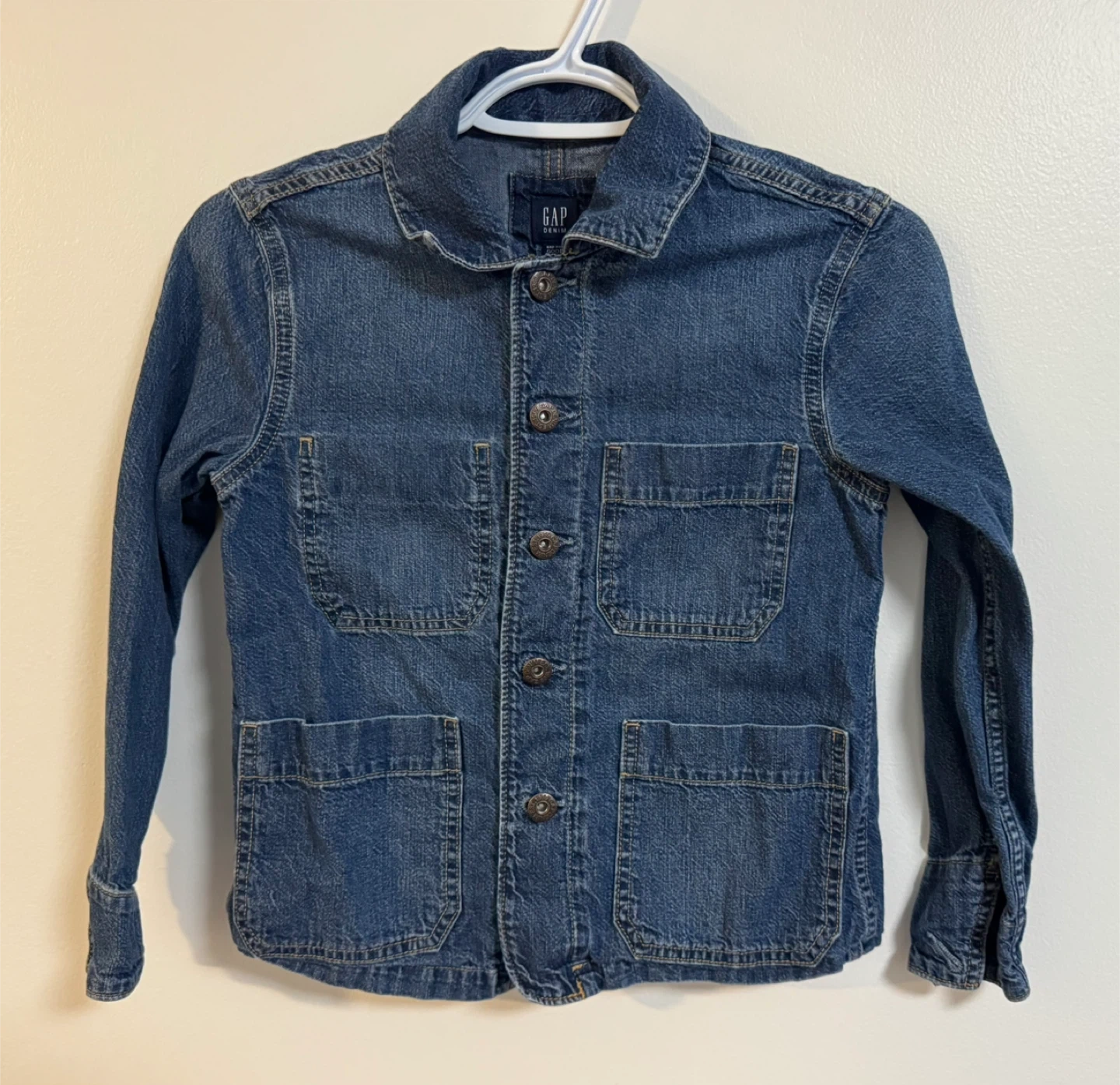 65Chic GAP denim jacket for kids. Features button-up front and dual chest pockets. Ideal for layering.