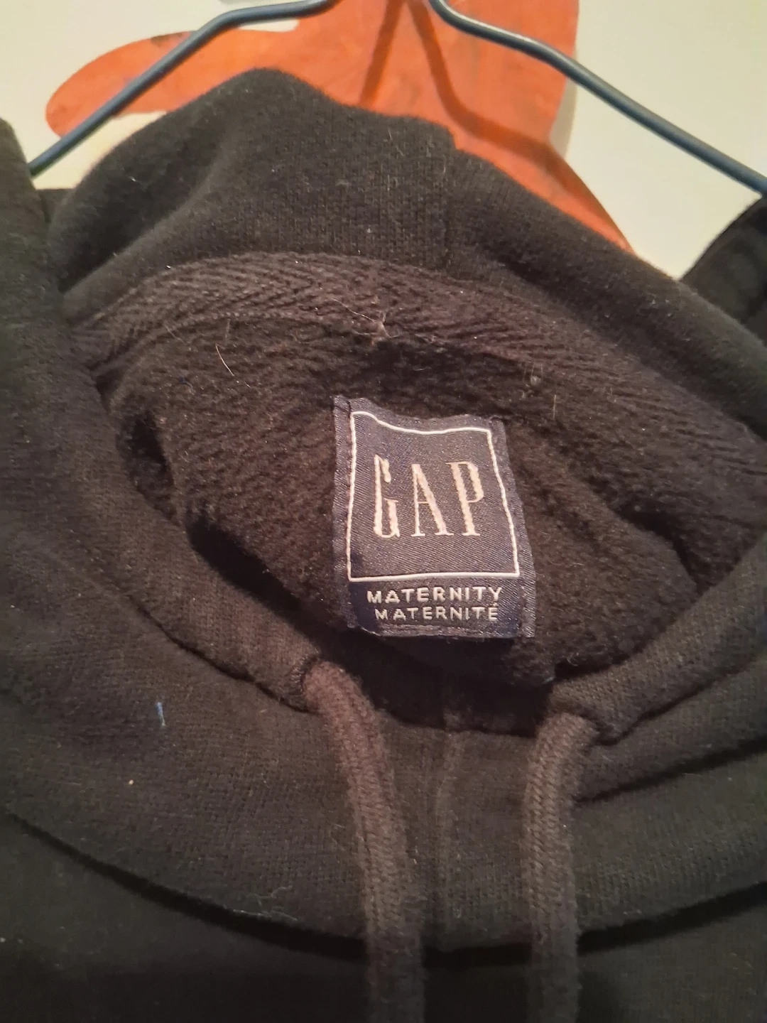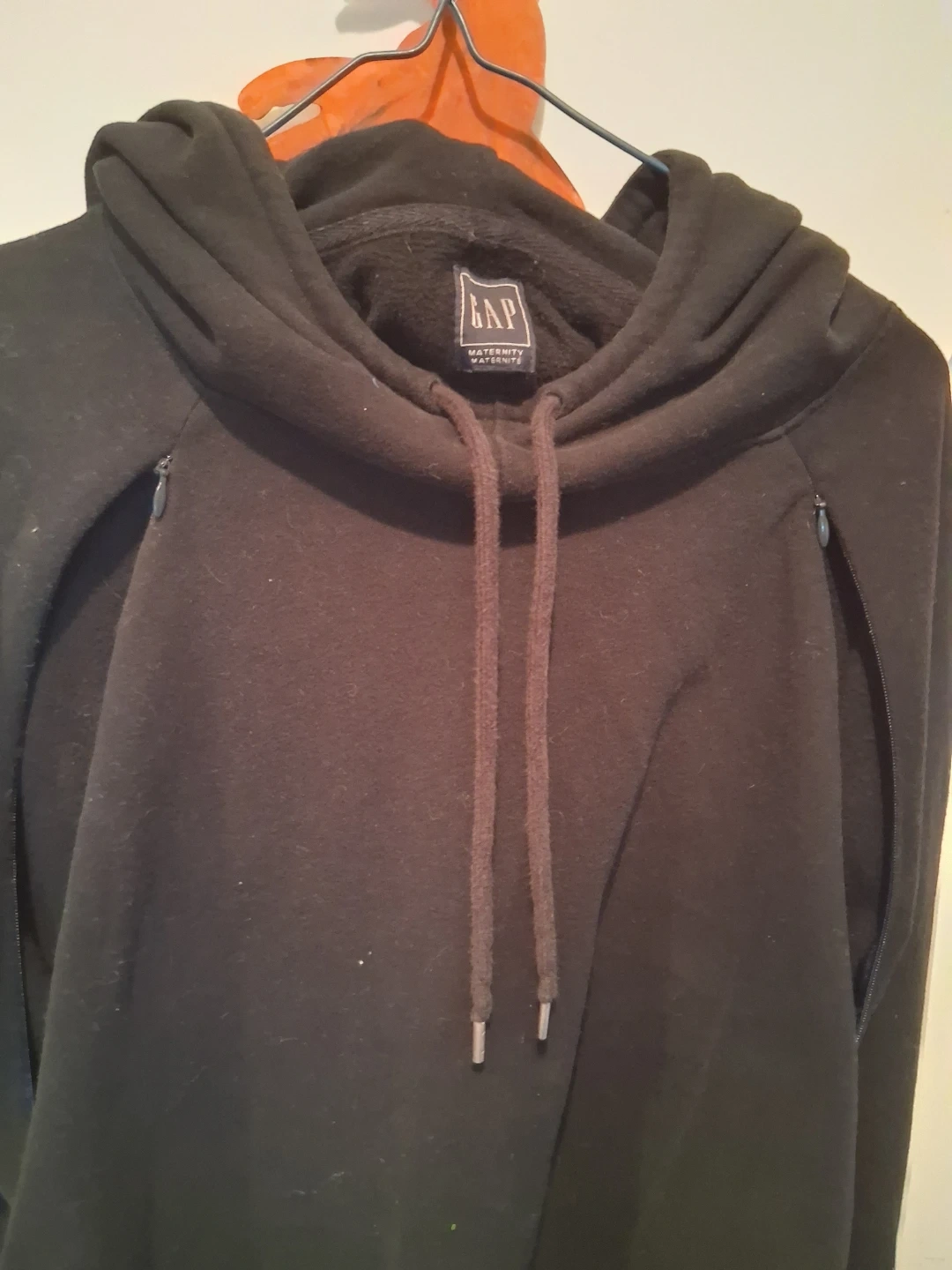 549Selling a comfy black GAP Maternity hoodie in size XL. It's in great shape and perfect for expecting mothers! The hoodie is made from 81% cotton and 19% polyester, making it soft and easy to care for. If you look in the pictures there are zippers in each side that open for breastfeeding.