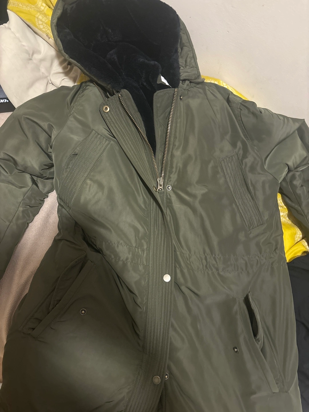 Warm olive green puffer jacket. Features a black faux fur lined hood and zipper closure. Multiple pockets. Long length.