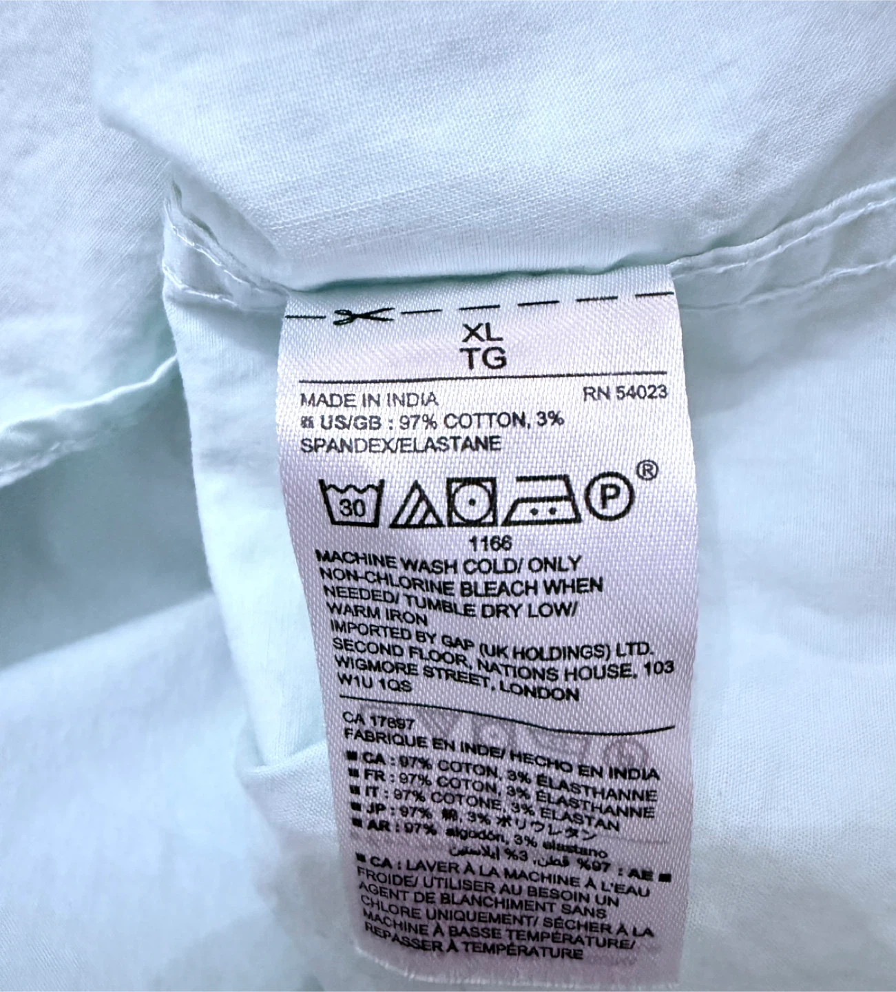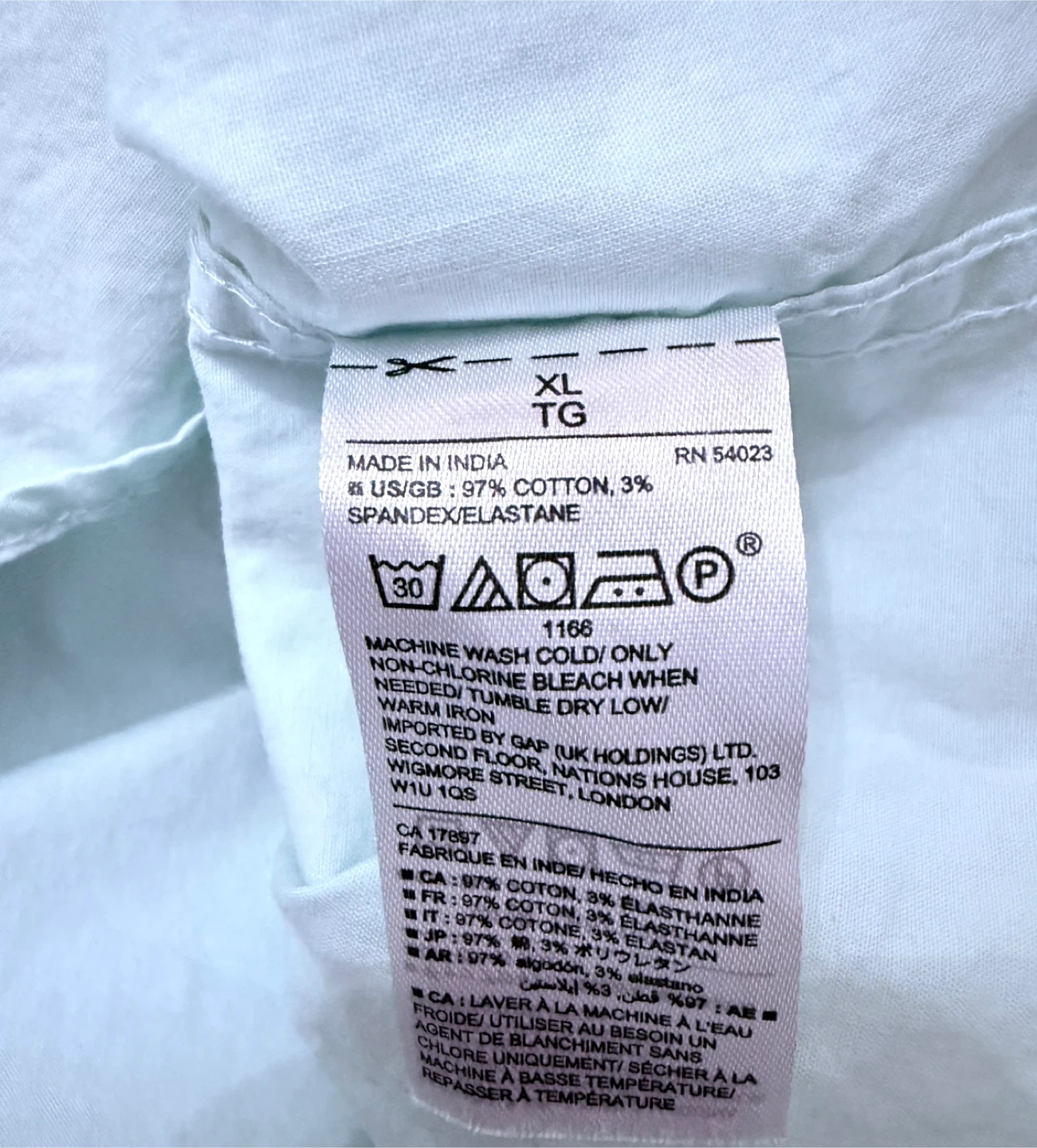 442Here's a light green Gap button-down shirt in size XL. It's a slim fit and made from 97% cotton and 3% spandex/elastane. Perfect for a casual or slightly dressed-up look! Ptp 24” Length 31”