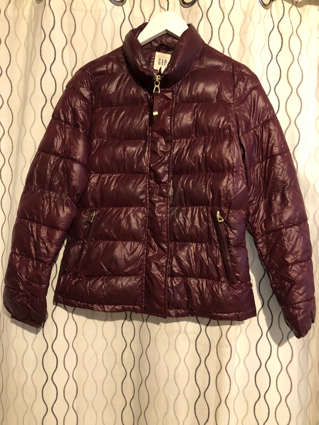 36I'm selling a gently used GAP puffer jacket in size SP. It's a beautiful burgundy colour and perfect for layering during the colder months. It's lightweight and easy to pack, making it great for travel too!