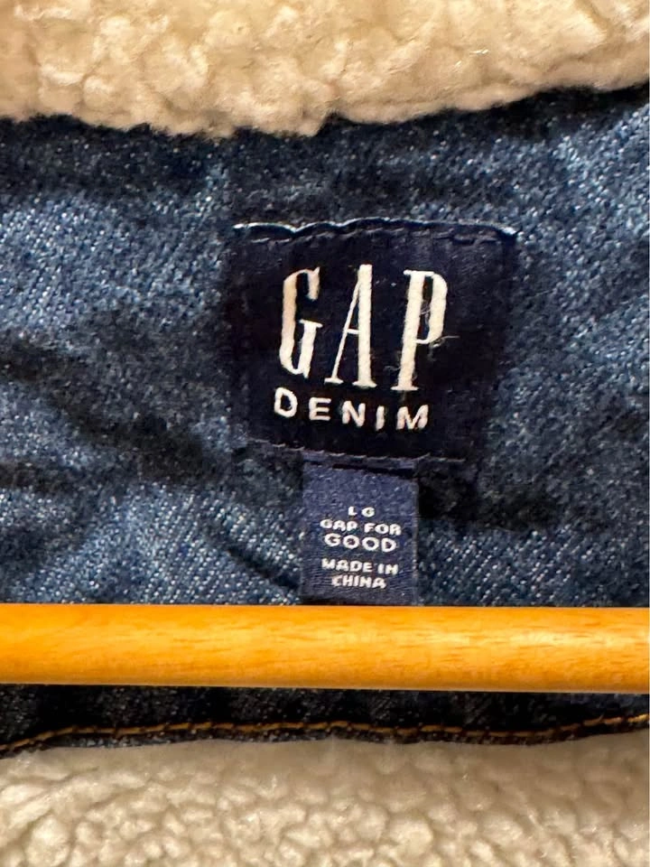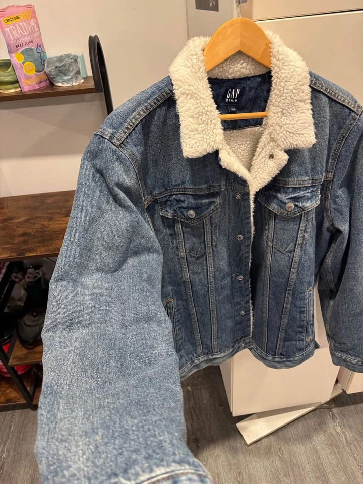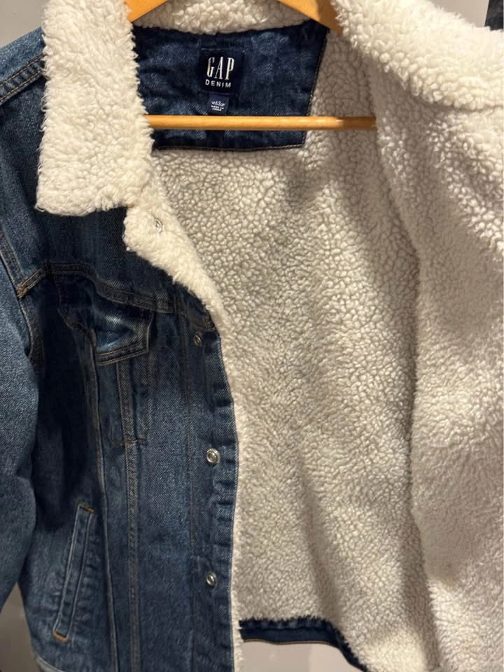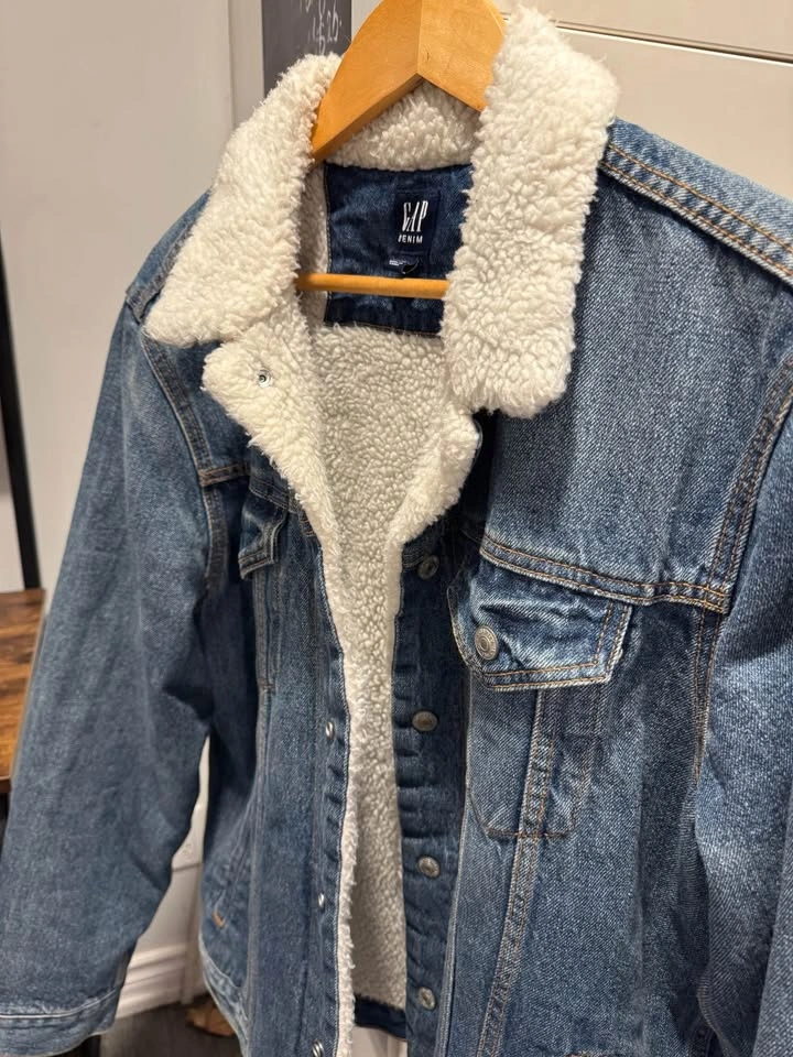 Stay warm and stylish this fall with this classic GAP Denim jacket featuring a super-soft sherpa lining and collar. It’s the perfect cozy layering piece for chilly weather — casual yet timeless. • Size: Large (Unisex fit) • Brand: GAP Denim – “Gap for Good” • Warm, fuzzy interior & collar • Excellent condition – clean, no damage or stains • Great for everyday wear, layering, or adding a vintage vibe to your outfit 💙 Pickup in Hamilton – ready to wear and perfect for the season!