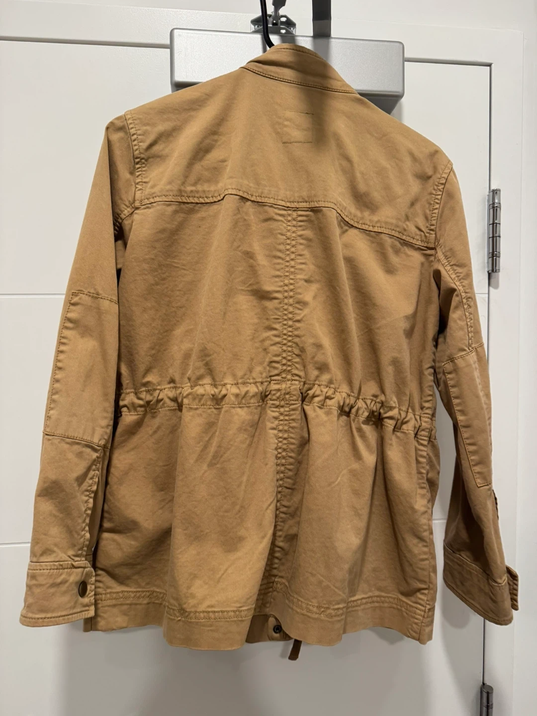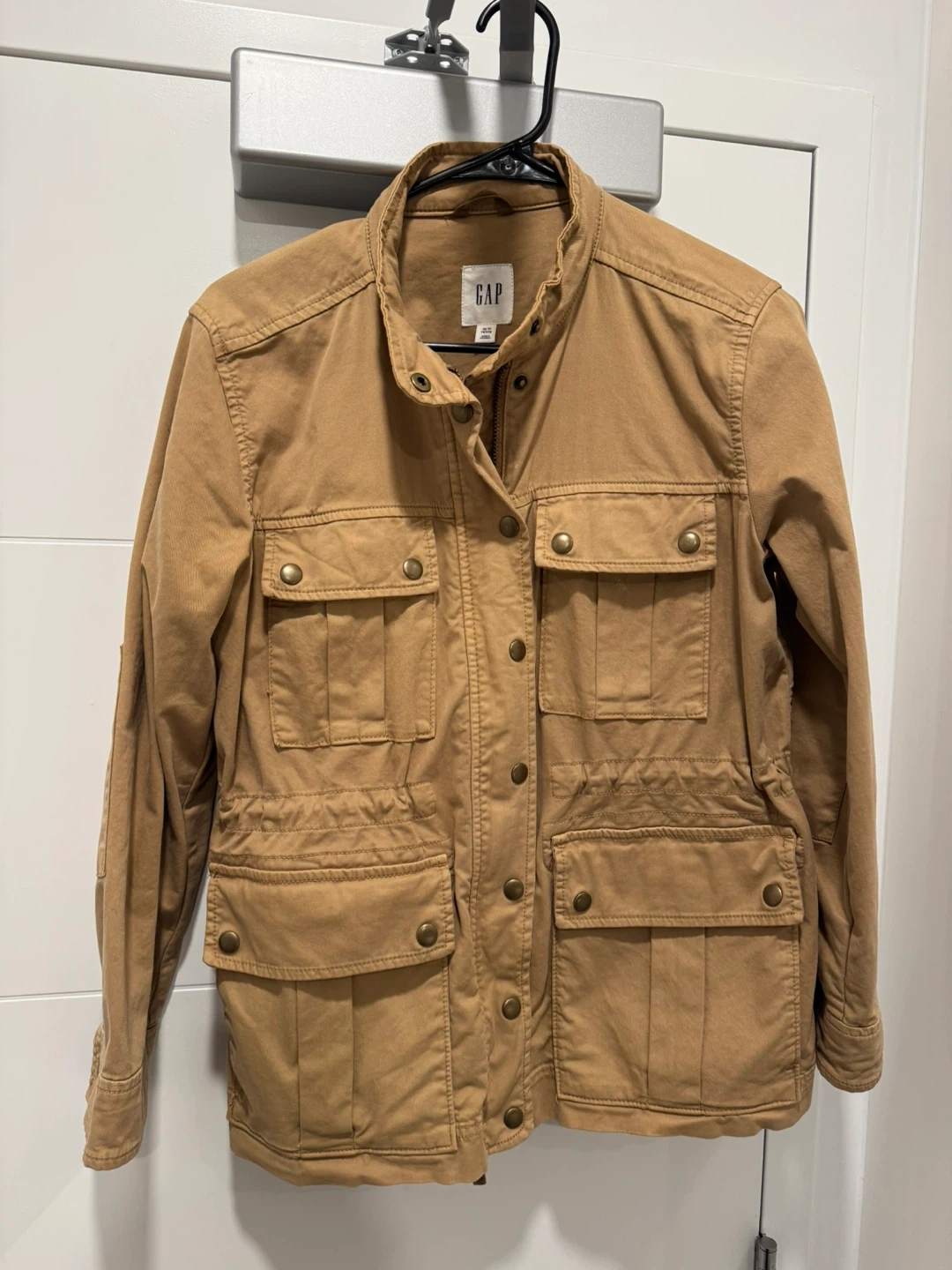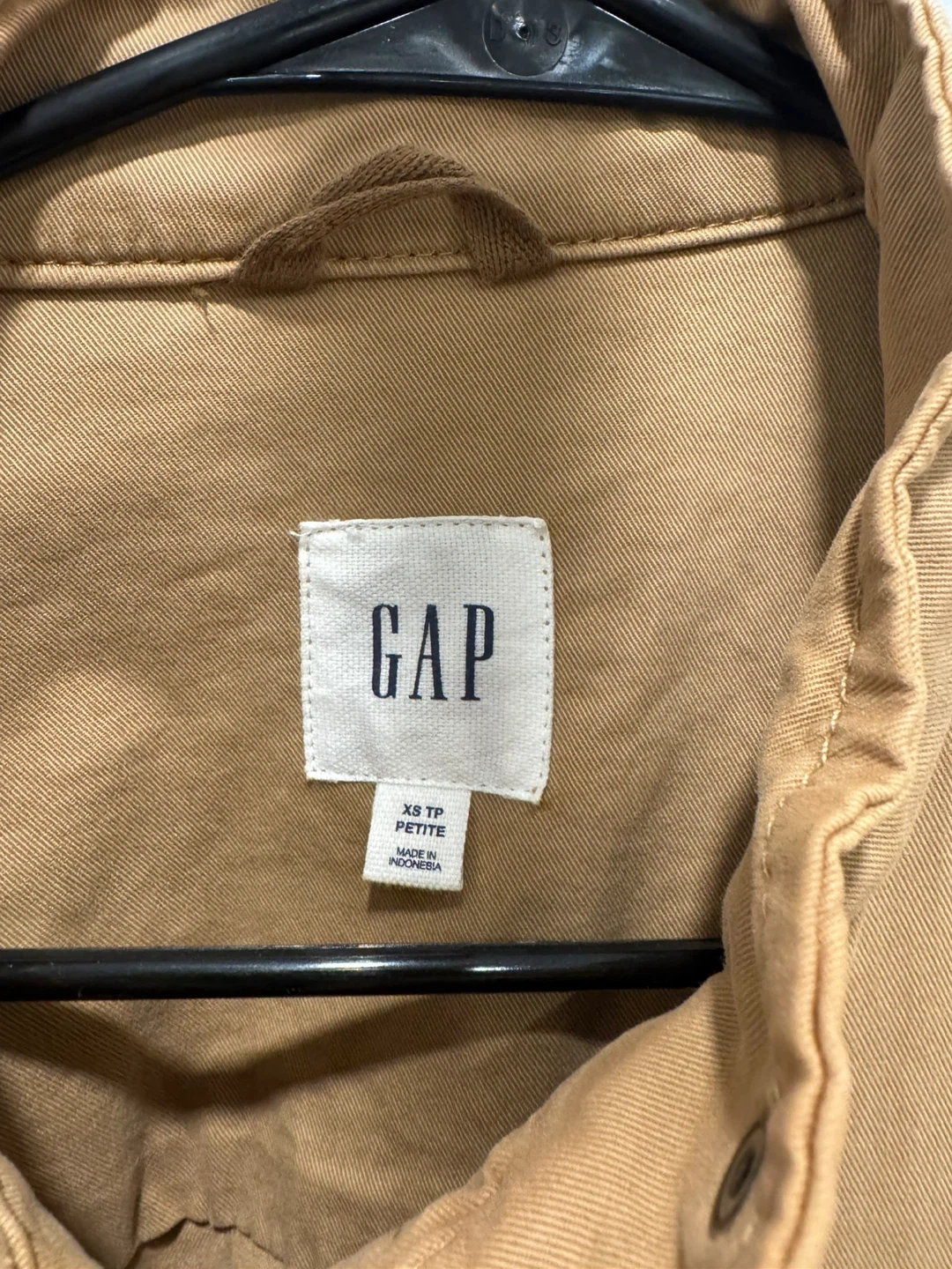 A stylish tan jacket from GAP in size XS Petite. But fits small and medium. It's in great condition and ready for a new home!