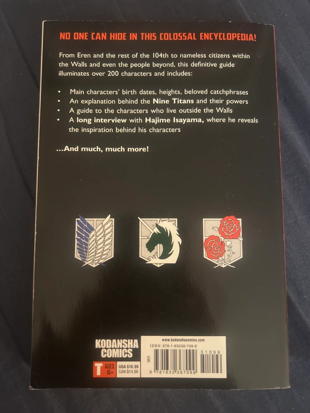 Attack on Titan character encyclopedia. Contains information on over 200 characters. Contains an interview with Hajime Isayama on inspiration behind the characters!