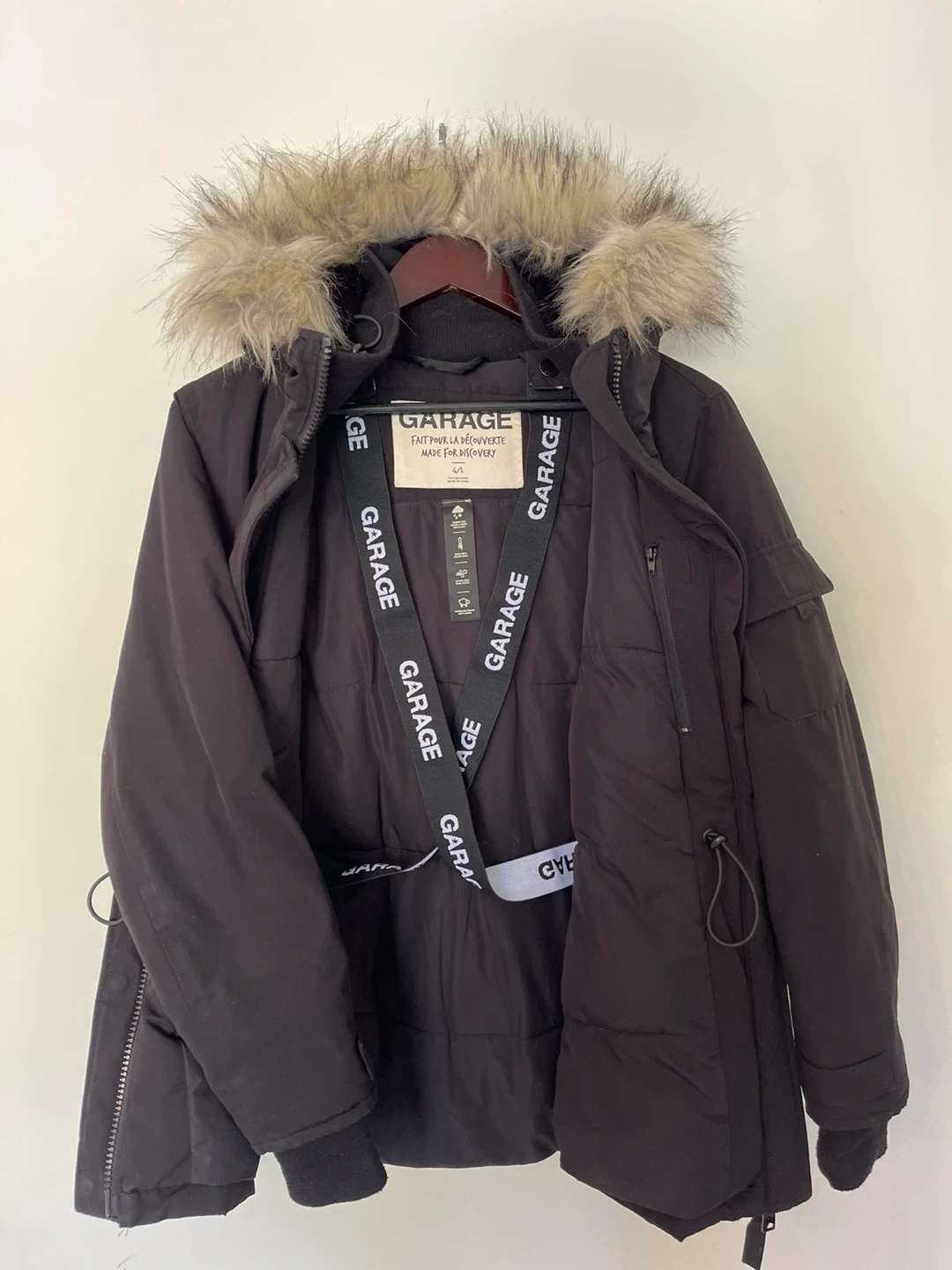28Women’s Black Garage Made For Discovery Parka Good Condition Women’s size small $30 cash only please Features: * detachable faux fur on hood * suspender carrying straps * front has magnetic closure top flap pockets and also side slit pockets plus two zippered chest pockets * sleeve and hidden inside pocket * adjustable cinch waistband * velcro cinch strap at the wrists to prevent snow or cold air from entering Smoke free pet free home Meet at Tim Horton’s/Shell Station at 780 South Sheridan Way Mississauga L5H1Z6 Please see what else I have for sale. Thank you.