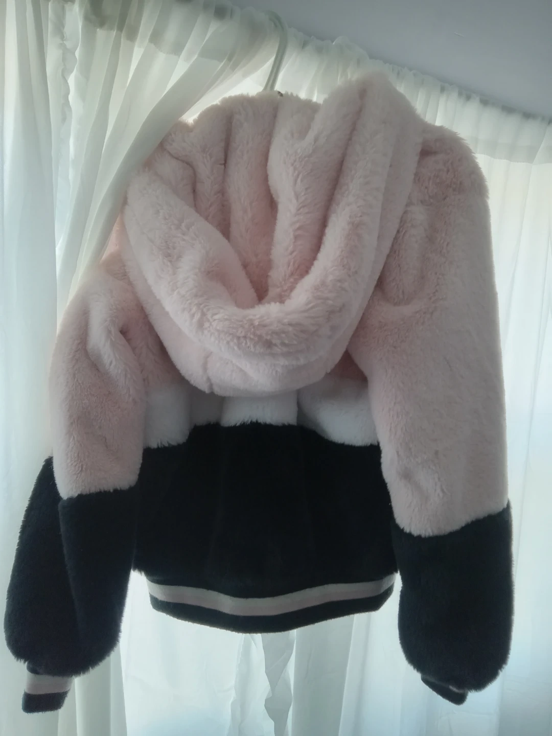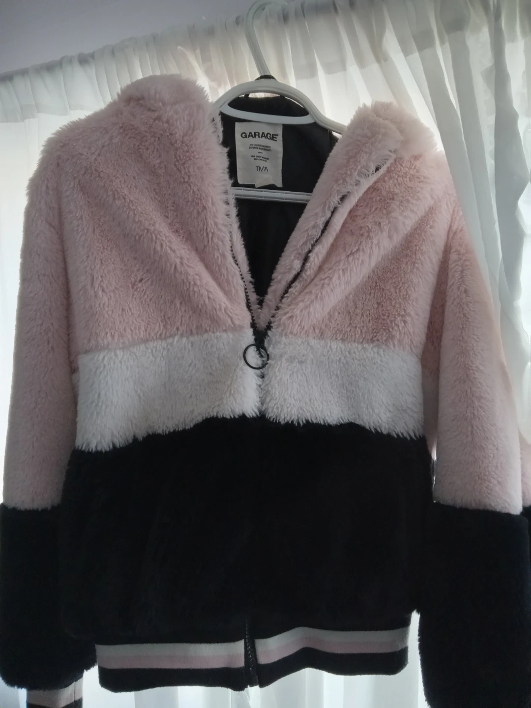 0Selling a super cute Garage faux fur hoodie! It's a colour block design with pink, white, and black. Size is XS Perfect for keeping cozy!