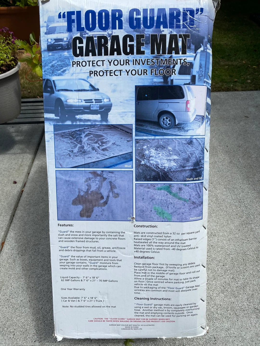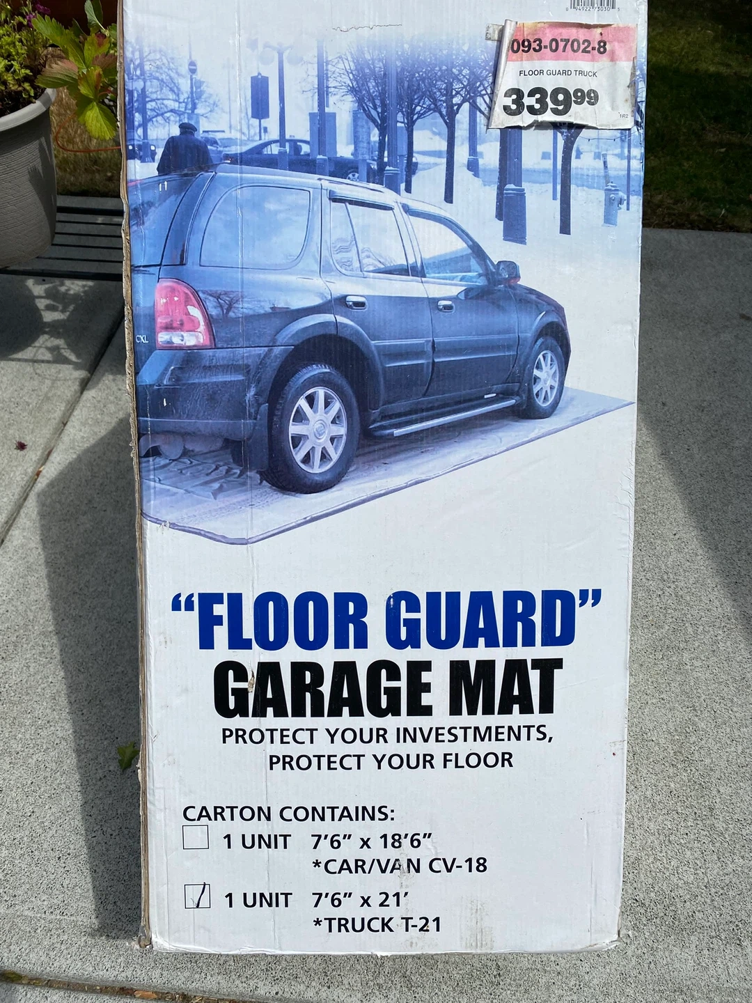 5Garage mat for sale in Sidney. Rainy season and snow coming before too long so why not plan ahead. Gently used. No rips or tears. Keep your garage floor clean. Make me an offer! The carton contains one 7'6" x 21'6" mat. Originally bought for $339.99