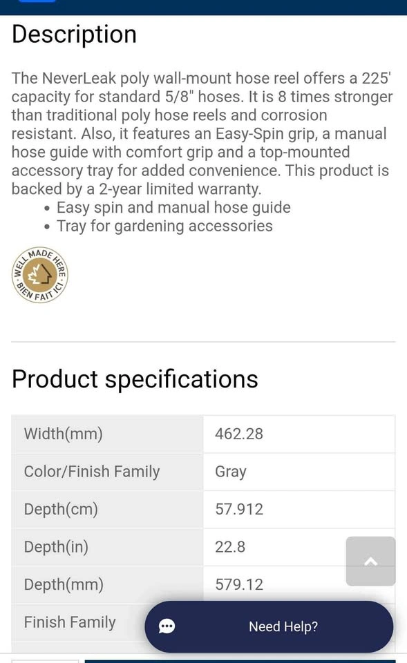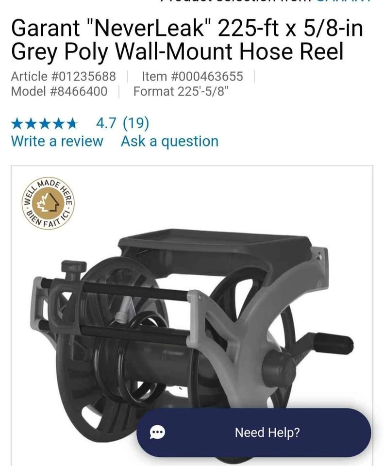 Garant "NeverLeak" poly wall-mount hose reel offers a 225' capacity for standard 5/8" hoses. It is 8 times stronger than traditional poly hose reels and corrosion resistant. Also, it features an Easy-Spin grip, a manual hose guide with comfort grip and a top-mounted accessory tray for added convenience. This product is backed by a 2-year limited warranty. Easy spin and manual hose guide Tray for gardening accessories Pick up near 6th line and Margot St in Oakville
