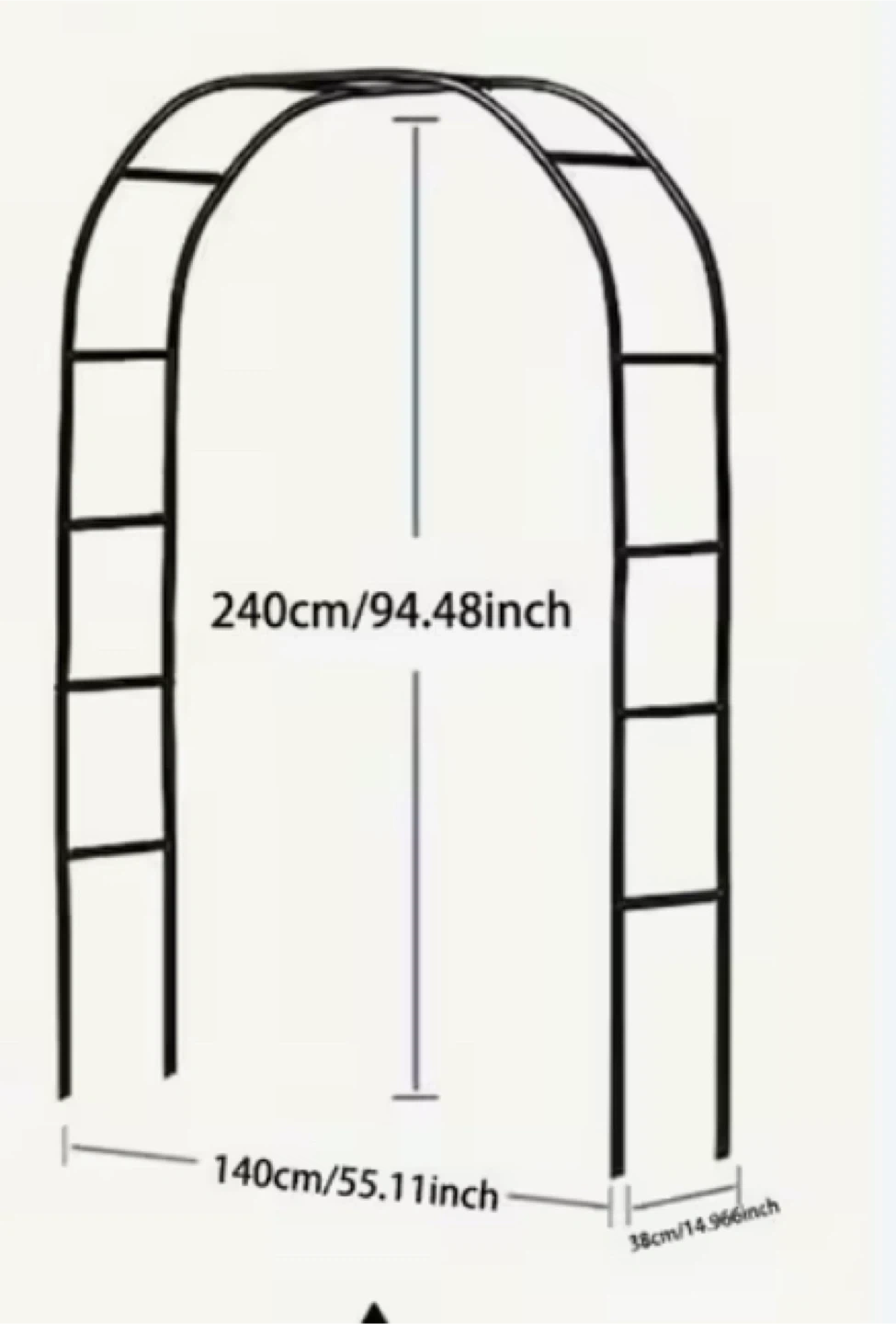 76This garden arch is perfect for adding a touch of elegance to your outdoor space. It's made of sturdy black metal and measures 94.48 inches in height, 55.11 inches in width, and 14.96 inches in depth. It's easy to assemble and will look great with climbing plants!