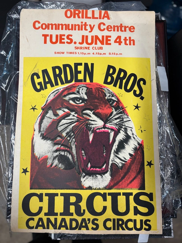 97Own a piece of history with this vintage Garden Bros Circus poster, advertising their show at the Orillia Community Centre on June 4th. This poster is in used condition, showing its age and history.