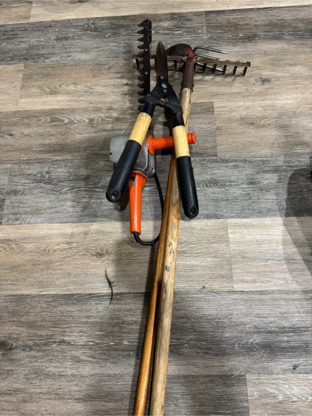 10A collection of gardening tools including a hedge trimmer, rake, and other items. Perfect for getting your yard in shape!