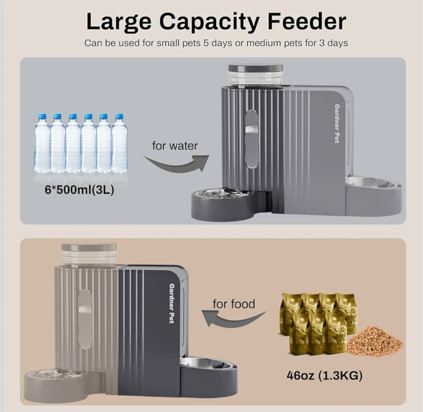 Keep your furry friend happy and hydrated with this Gardner Pet 2-in-1 food and water dispenser! It features an adjustable bowl that rotates 180° for easy cleaning. It has a large capacity feeder, holding 3L of water and 1.3kg of food, so it can be used for small pets for 5 days or medium pets for 3 days. The sealed food containers prevent food from getting damp, and the circular water tank is BPA-free